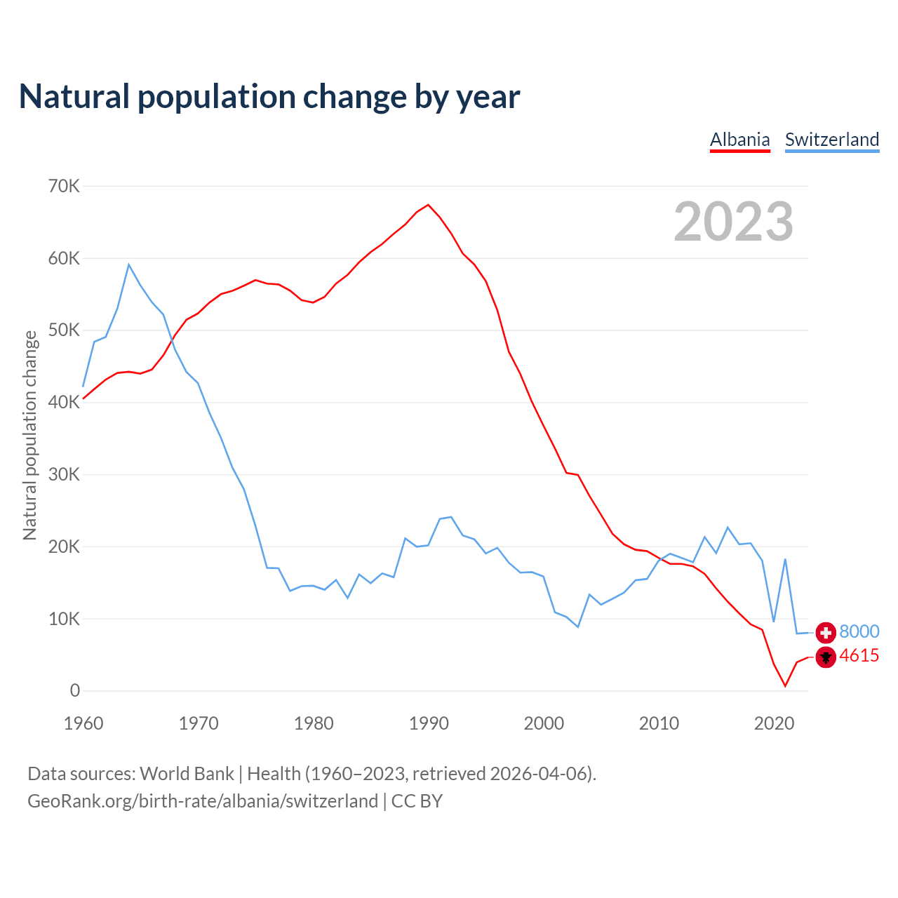 Albania has an annual birth rate of 10.2 births per 1,000 people, compared to 9 for Switzerland. The average number of children a woman is expected to have during her lifetime — the fertility rate, is 1.35 in Albania and 1.33 in Switzerland — 1.34% difference.