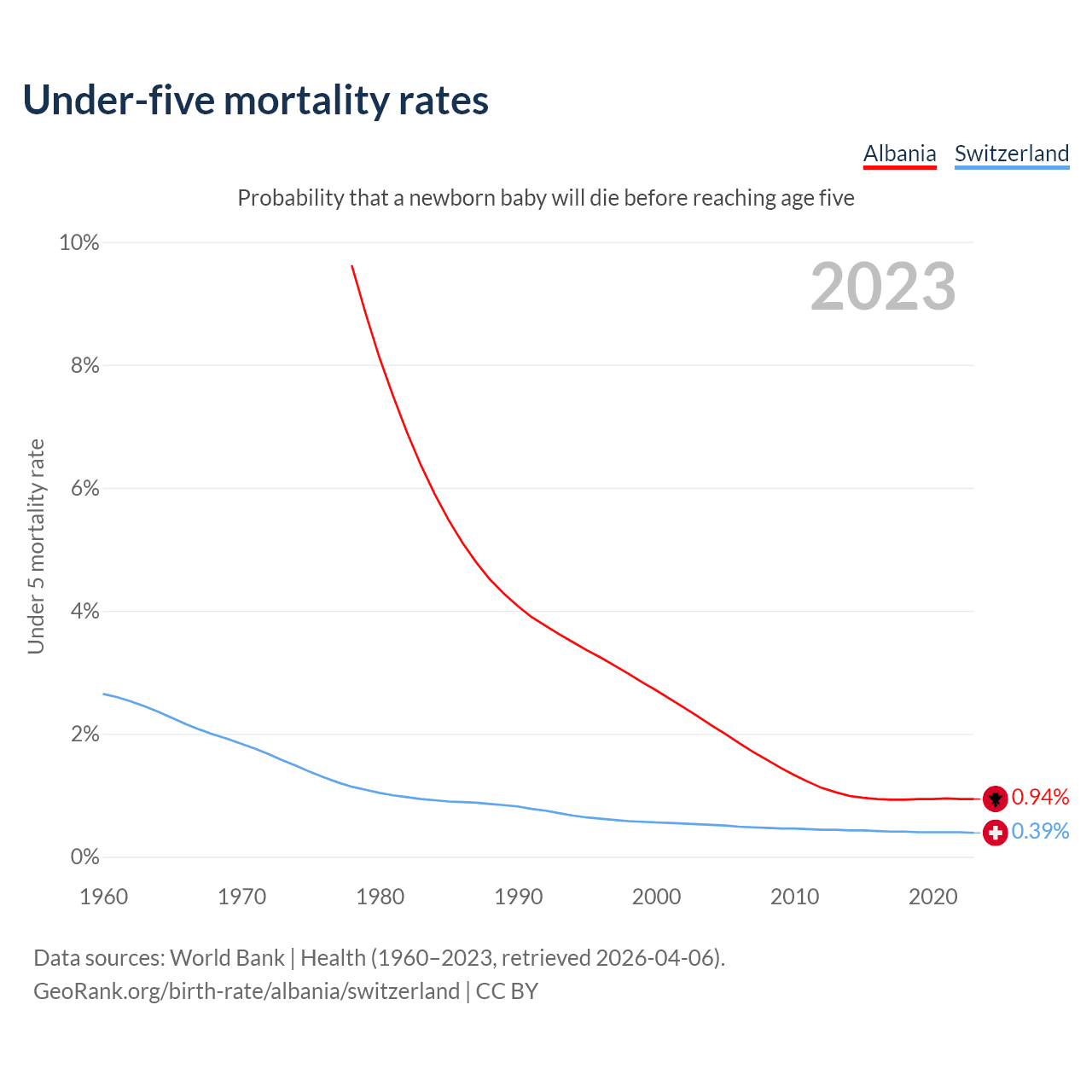 The chance that a newborn baby will die before reaching age five is 0.94% in Albania and 0.39% in Switzerland. Above is a chart with historical data on under-five mortality rates.