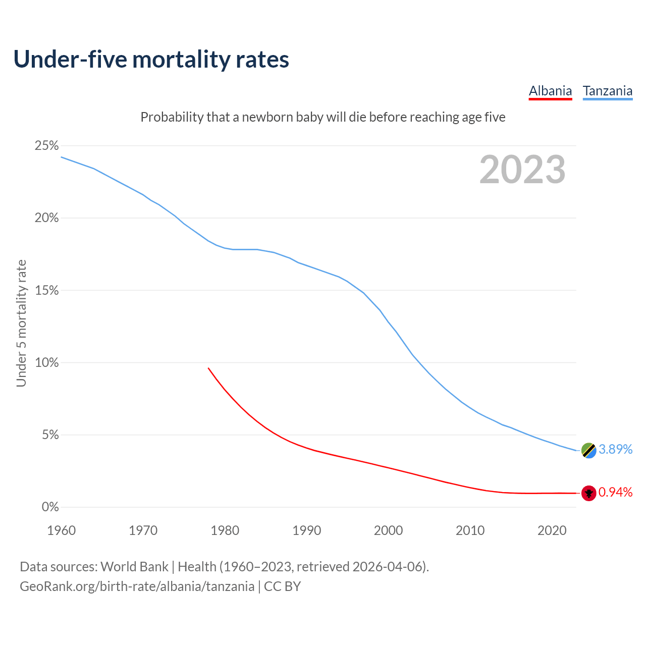 The chance that a newborn baby will die before reaching age five is 0.94% in Albania and 3.89% in Tanzania. Above is a chart with historical data on under-five mortality rates.