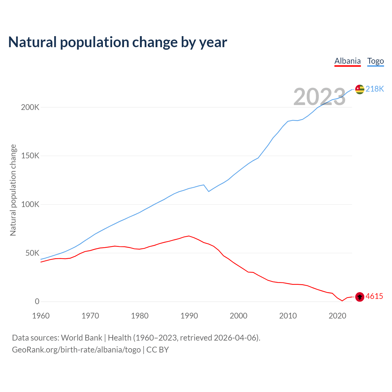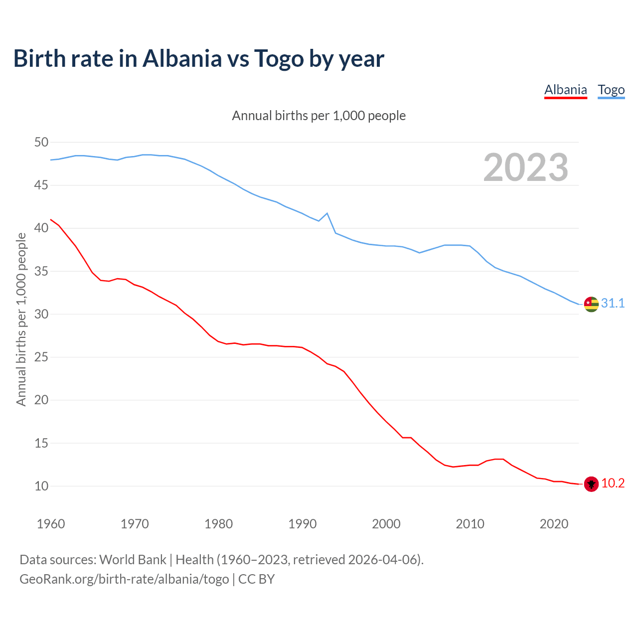 Albania has an annual birth rate of 10.2 births per 1,000 people, compared to 31.1 for Togo. The average number of children a woman is expected to have during her lifetime — the fertility rate, is 1.35 in Albania and 4.19 in Togo — 211% difference.