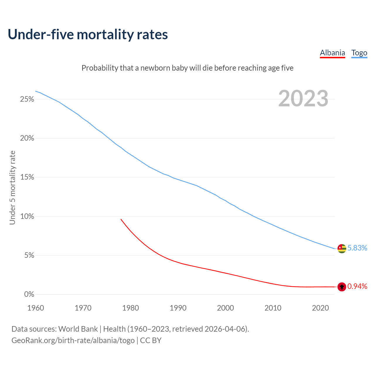 The chance that a newborn baby will die before reaching age five is 0.94% in Albania and 5.83% in Togo. Above is a chart with historical data on under-five mortality rates.