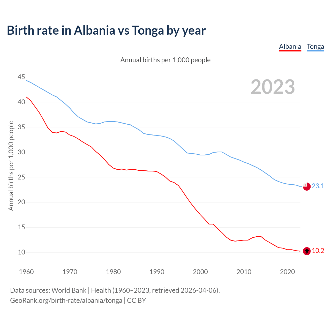 Albania has an annual birth rate of 10.2 births per 1,000 people, compared to 23.1 for Tonga. The average number of children a woman is expected to have during her lifetime — the fertility rate, is 1.35 in Albania and 3.13 in Tonga — 132.1% difference.