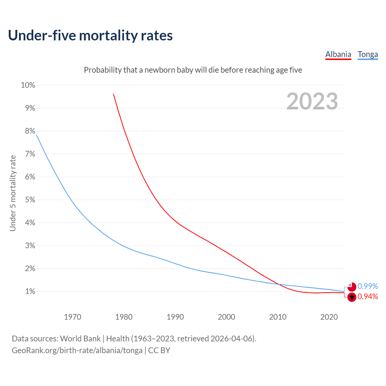 The chance that a newborn baby will die before reaching age five is 0.94% in Albania and 0.99% in Tonga. Above is a chart with historical data on under-five mortality rates.