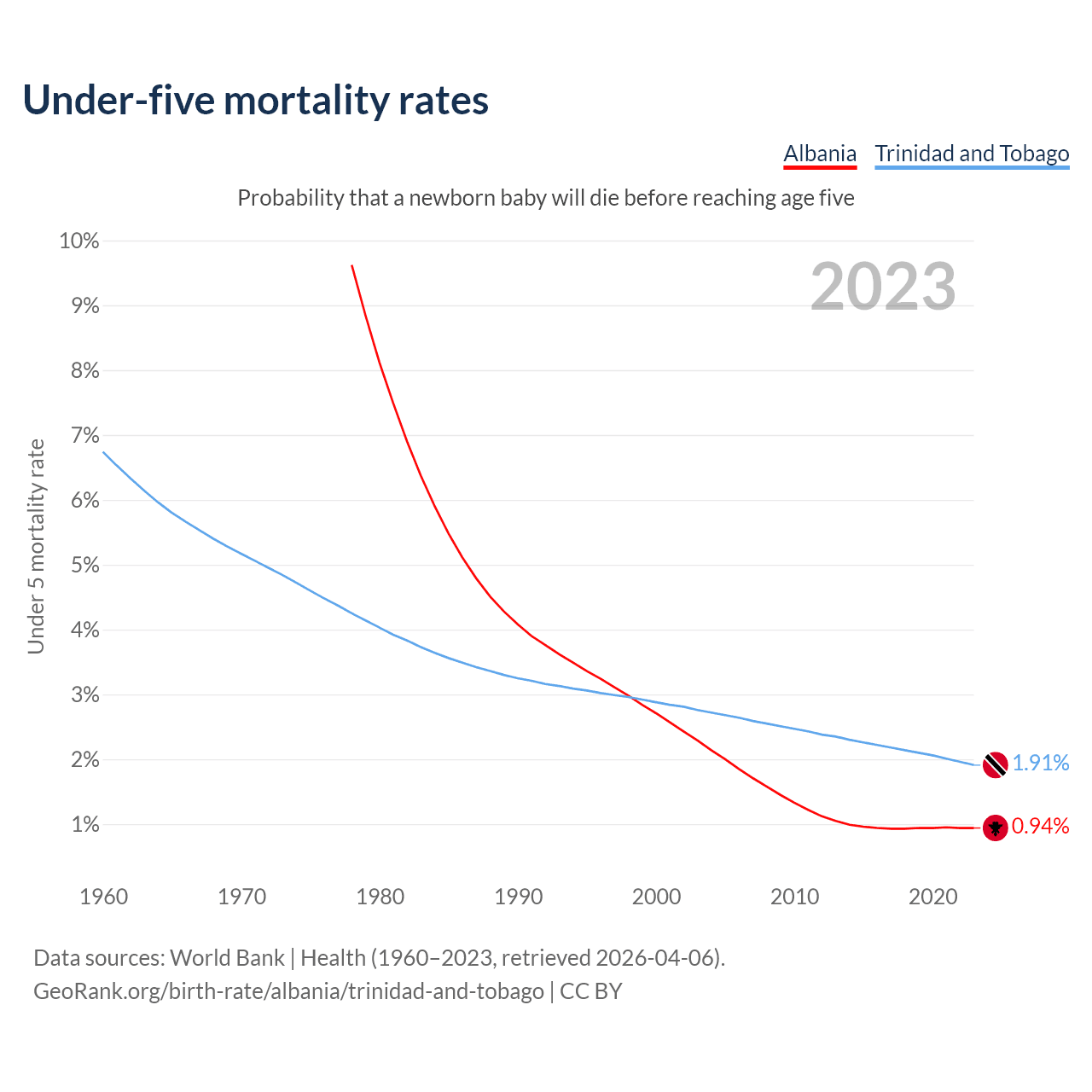 The chance that a newborn baby will die before reaching age five is 0.94% in Albania and 1.91% in Trinidad and Tobago. Above is a chart with historical data on under-five mortality rates.