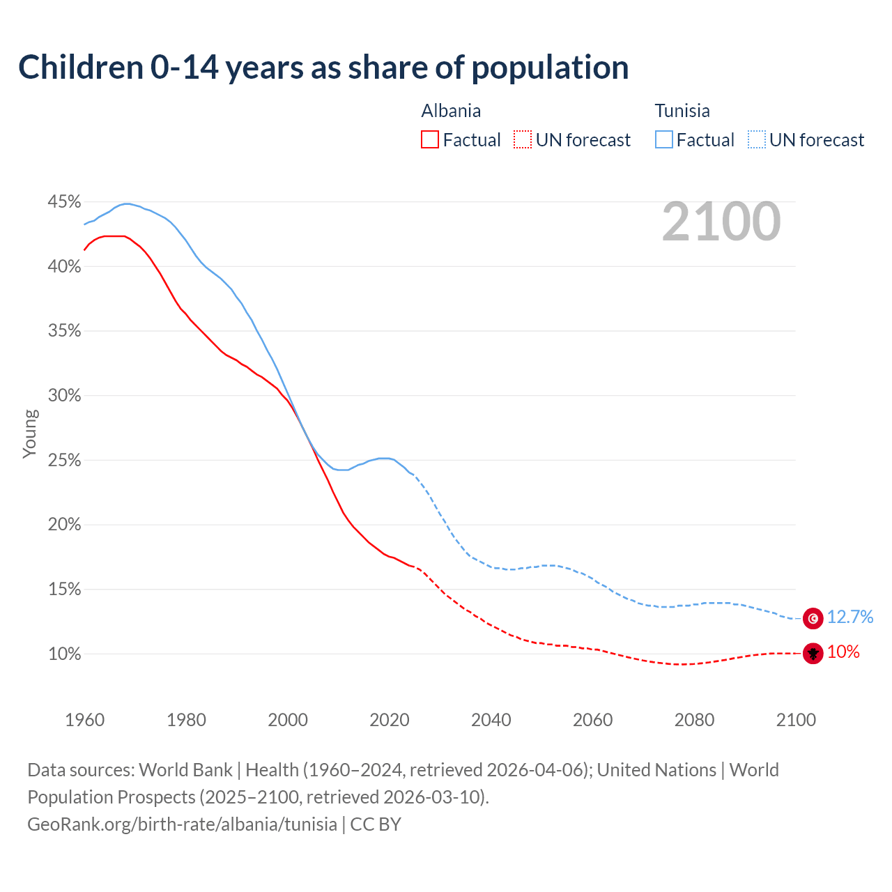 Albania has an annual birth rate of 10.2 births per 1,000 people, compared to 13.7 for Tunisia. The average number of children a woman is expected to have during her lifetime — the fertility rate, is 1.35 in Albania and 1.83 in Tunisia — 35.9% difference.