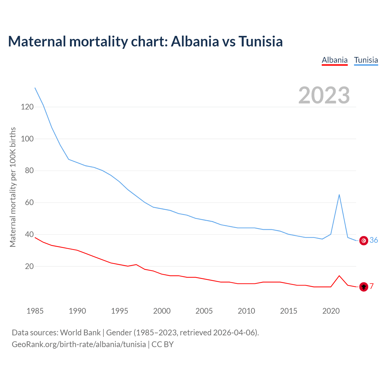 The maternal mortality rate, which is the probability of dying during childbirth or within 42 days of pregnancy termination, is 7 deaths per 100,000 live births in Albania, compared to 36 deaths in Tunisia.
