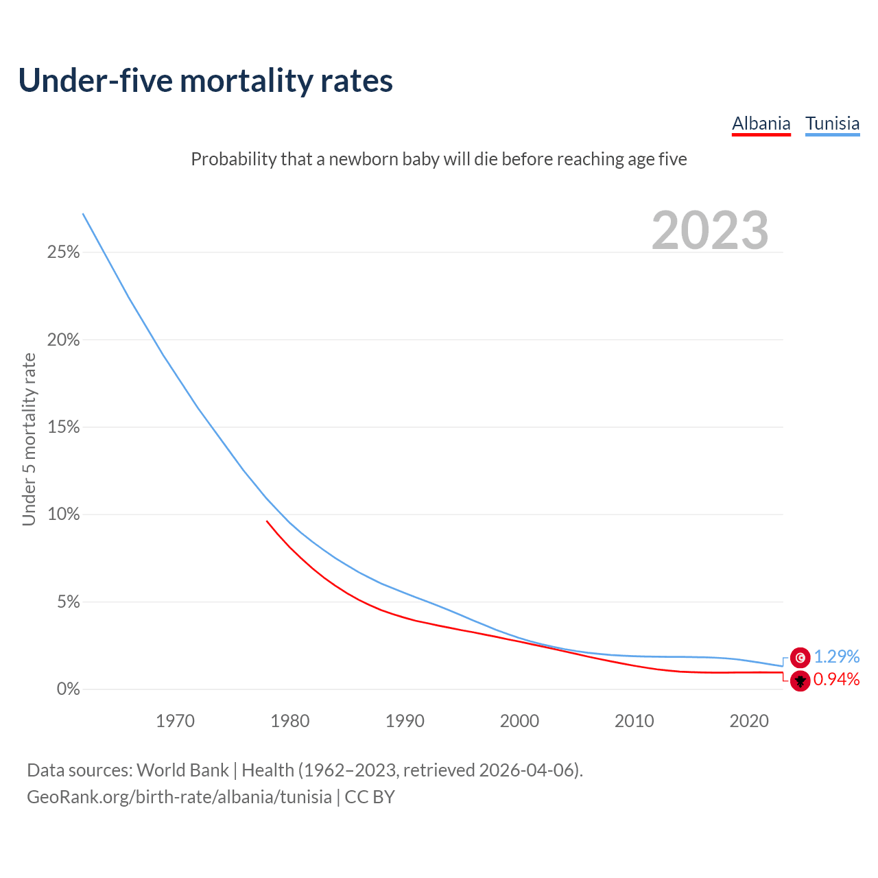 The chance that a newborn baby will die before reaching age five is 0.94% in Albania and 1.29% in Tunisia. Above is a chart with historical data on under-five mortality rates.