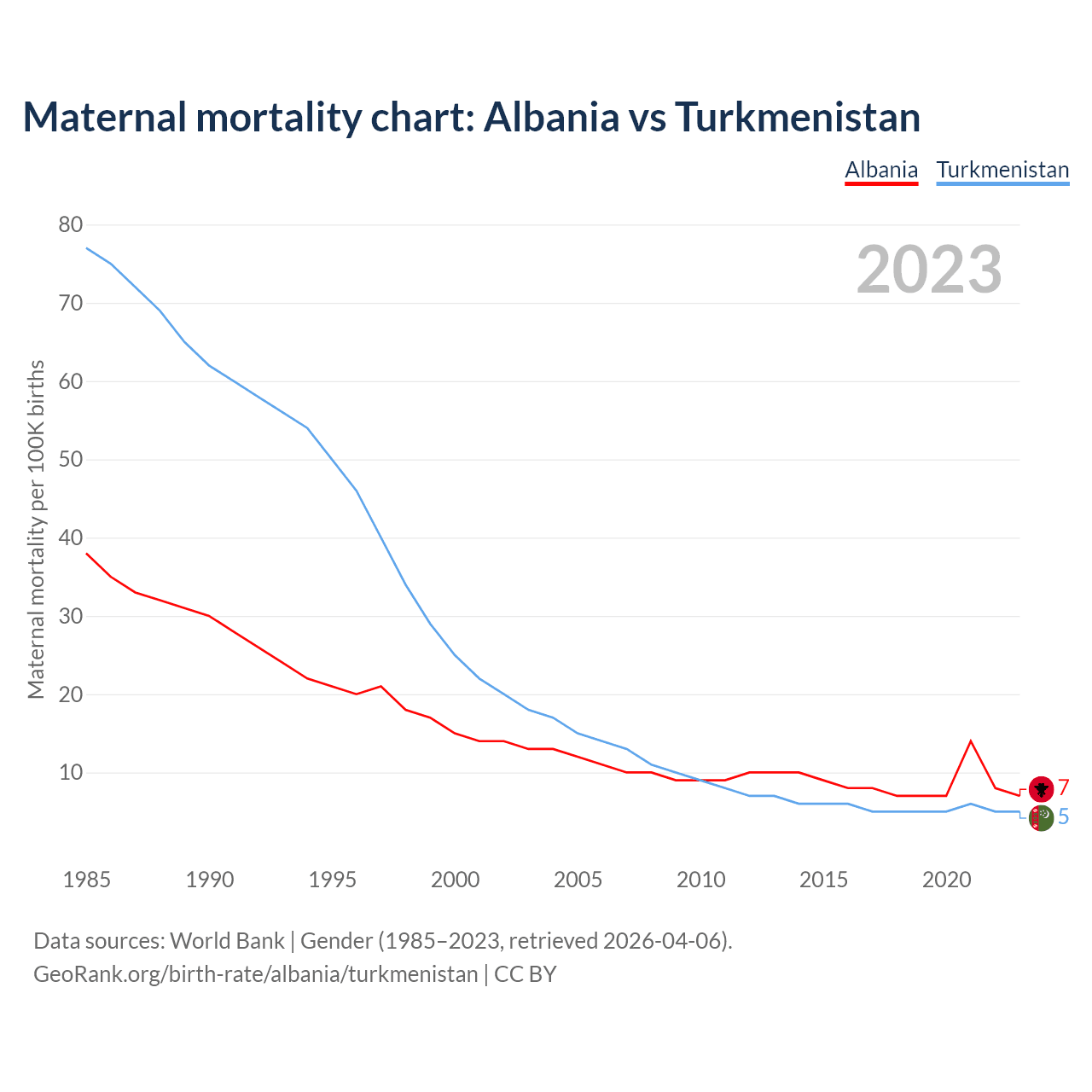 The maternal mortality rate, which is the probability of dying during childbirth or within 42 days of pregnancy termination, is 7 deaths per 100,000 live births in Albania, compared to 5 deaths in Turkmenistan.