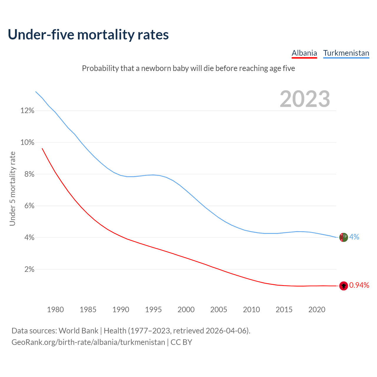 The chance that a newborn baby will die before reaching age five is 0.94% in Albania and 4% in Turkmenistan. Above is a chart with historical data on under-five mortality rates.