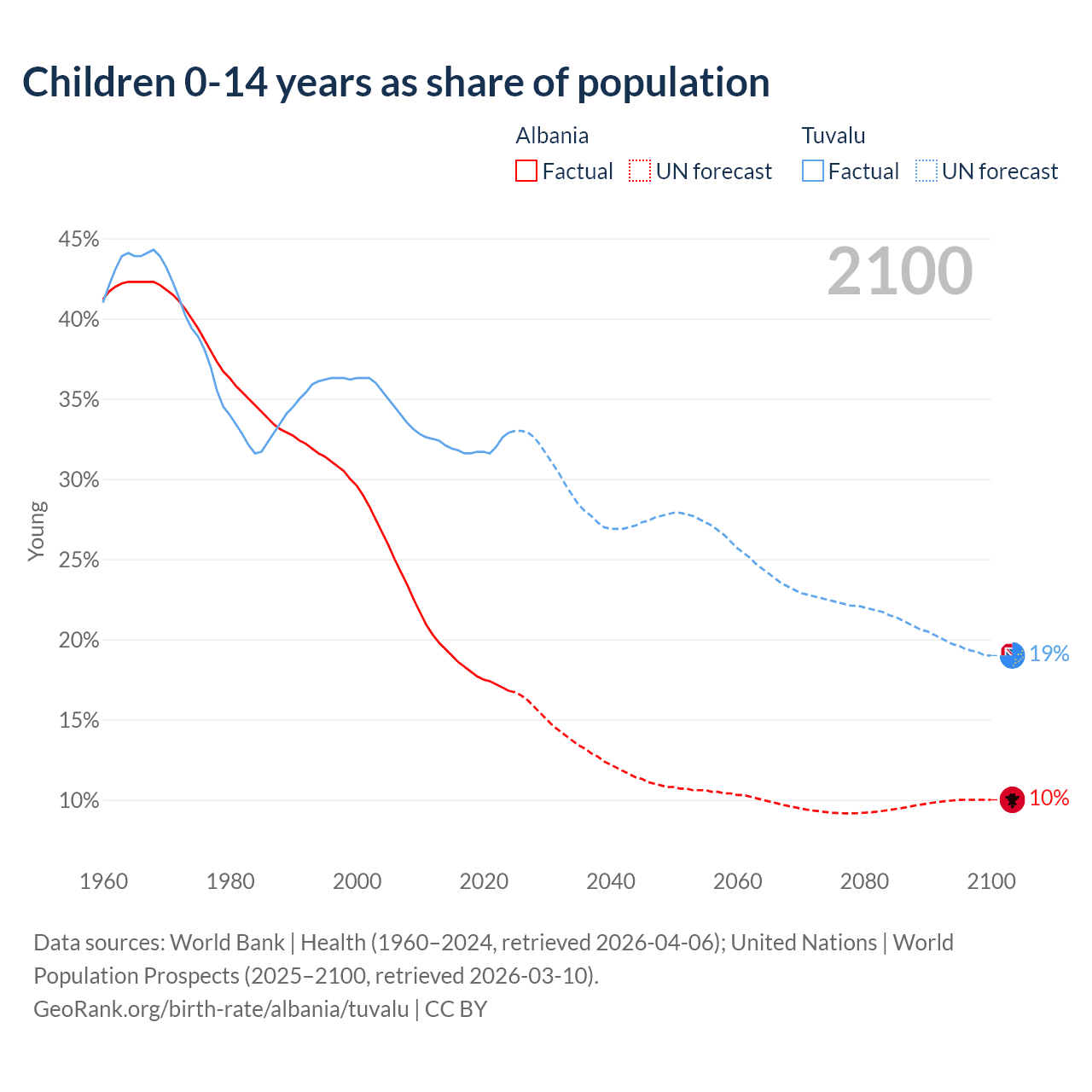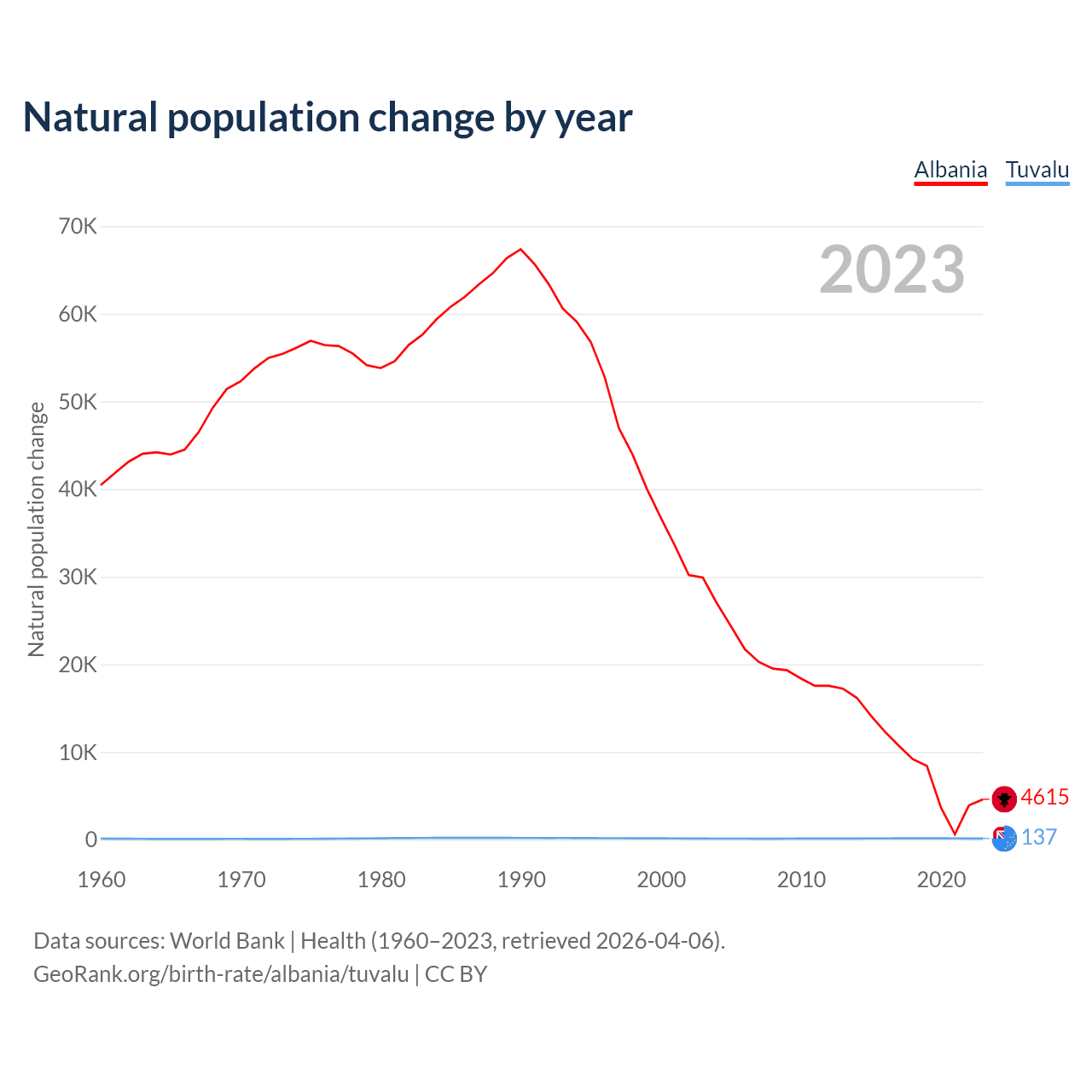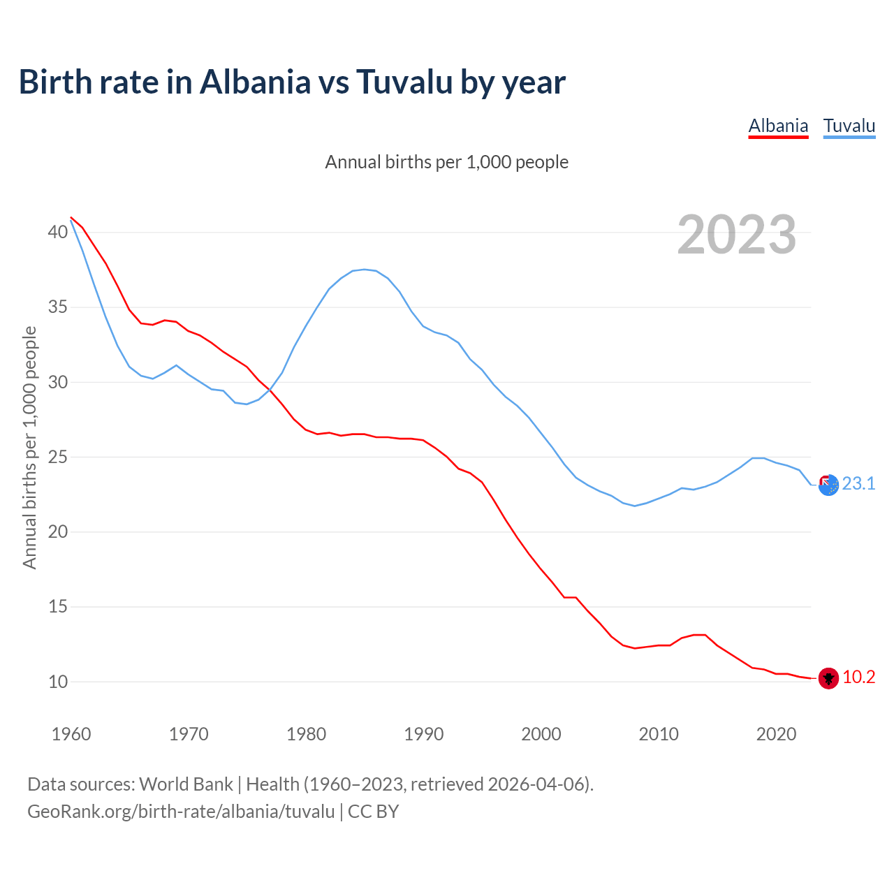 Albania has an annual birth rate of 10.2 births per 1,000 people, compared to 23.1 for Tuvalu. The average number of children a woman is expected to have during her lifetime — the fertility rate, is 1.35 in Albania and 3.21 in Tuvalu — 138% difference.