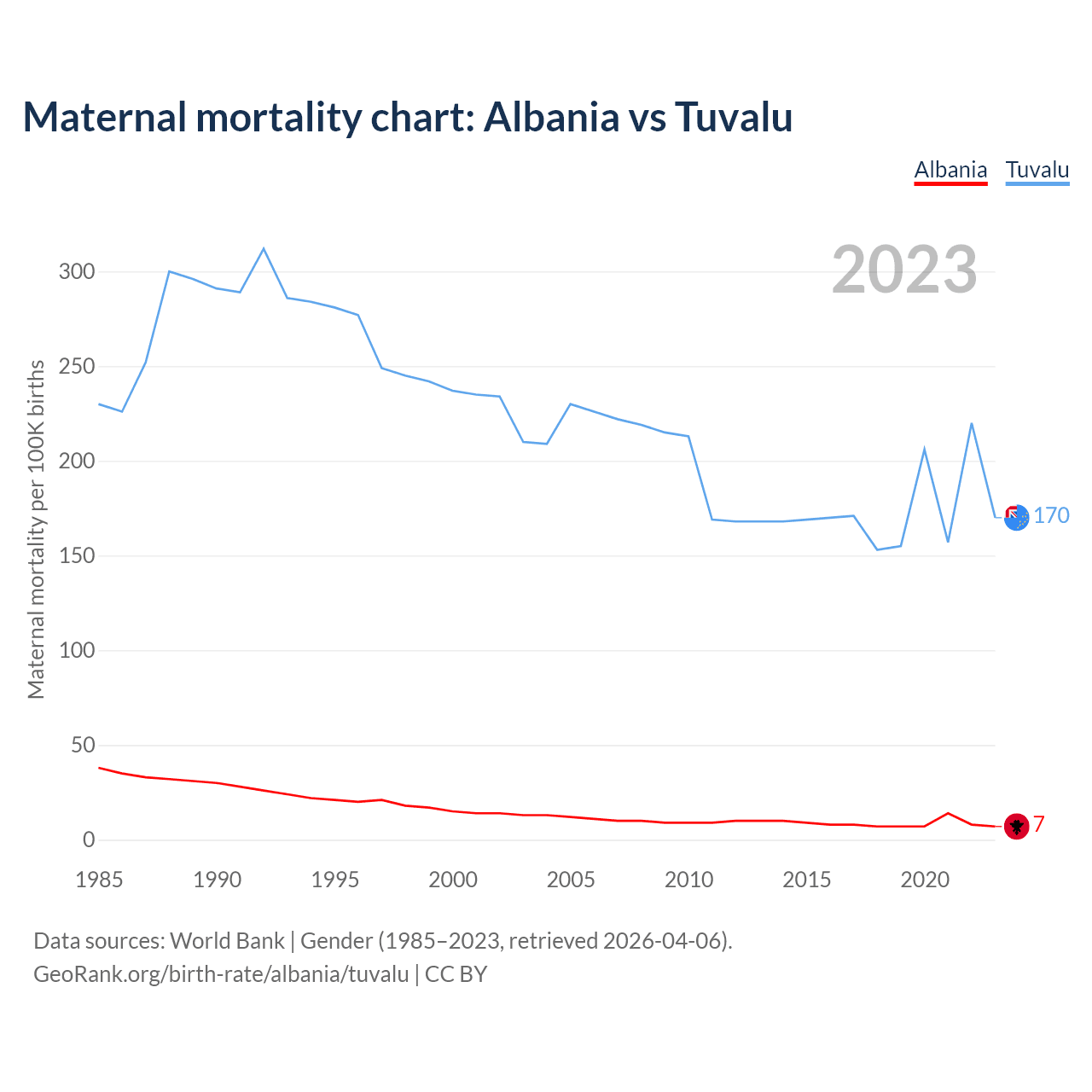 The maternal mortality rate, which is the probability of dying during childbirth or within 42 days of pregnancy termination, is 7 deaths per 100,000 live births in Albania, compared to 170 deaths in Tuvalu.