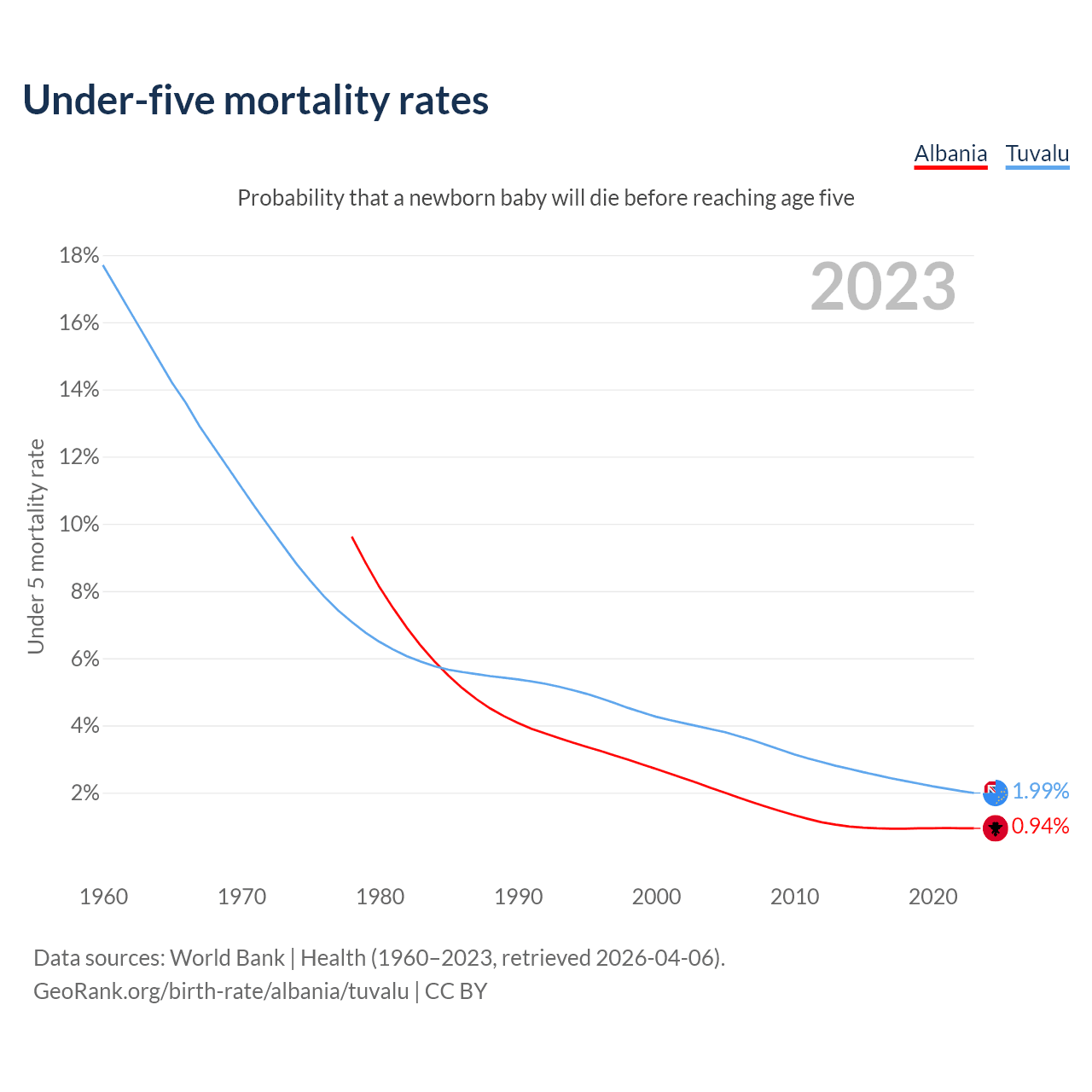 The chance that a newborn baby will die before reaching age five is 0.94% in Albania and 1.99% in Tuvalu. Above is a chart with historical data on under-five mortality rates.