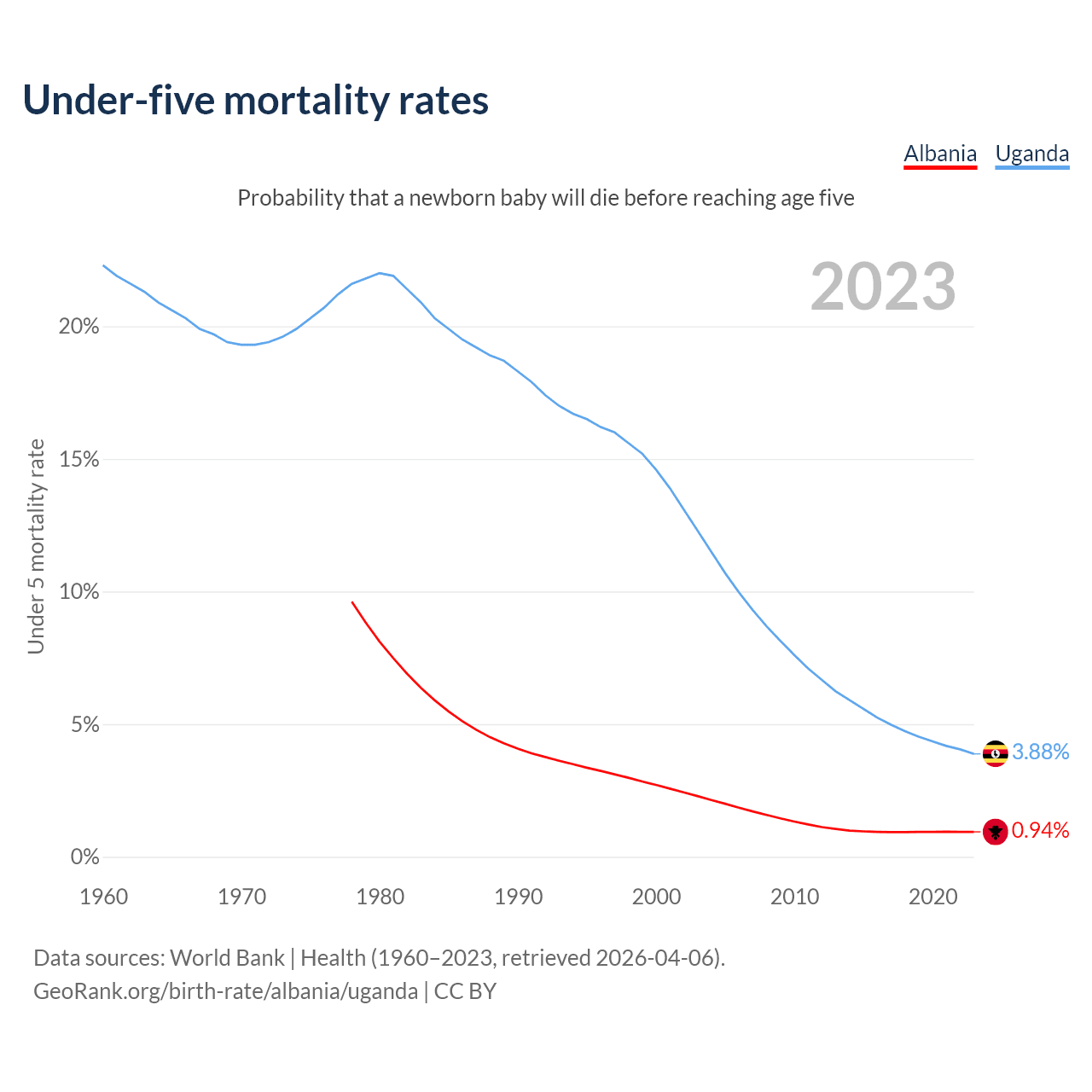 The chance that a newborn baby will die before reaching age five is 0.94% in Albania and 3.88% in Uganda. Above is a chart with historical data on under-five mortality rates.