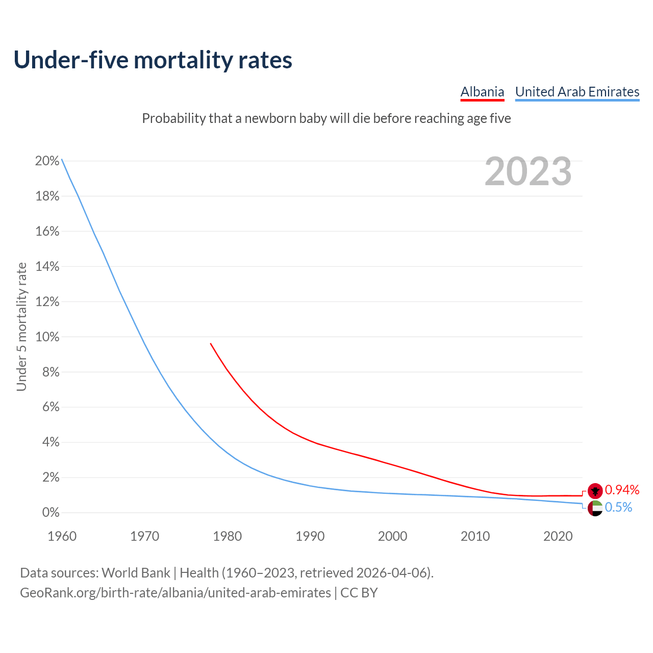 The chance that a newborn baby will die before reaching age five is 0.94% in Albania and 0.5% in the United Arab Emirates. Above is a chart with historical data on under-five mortality rates.