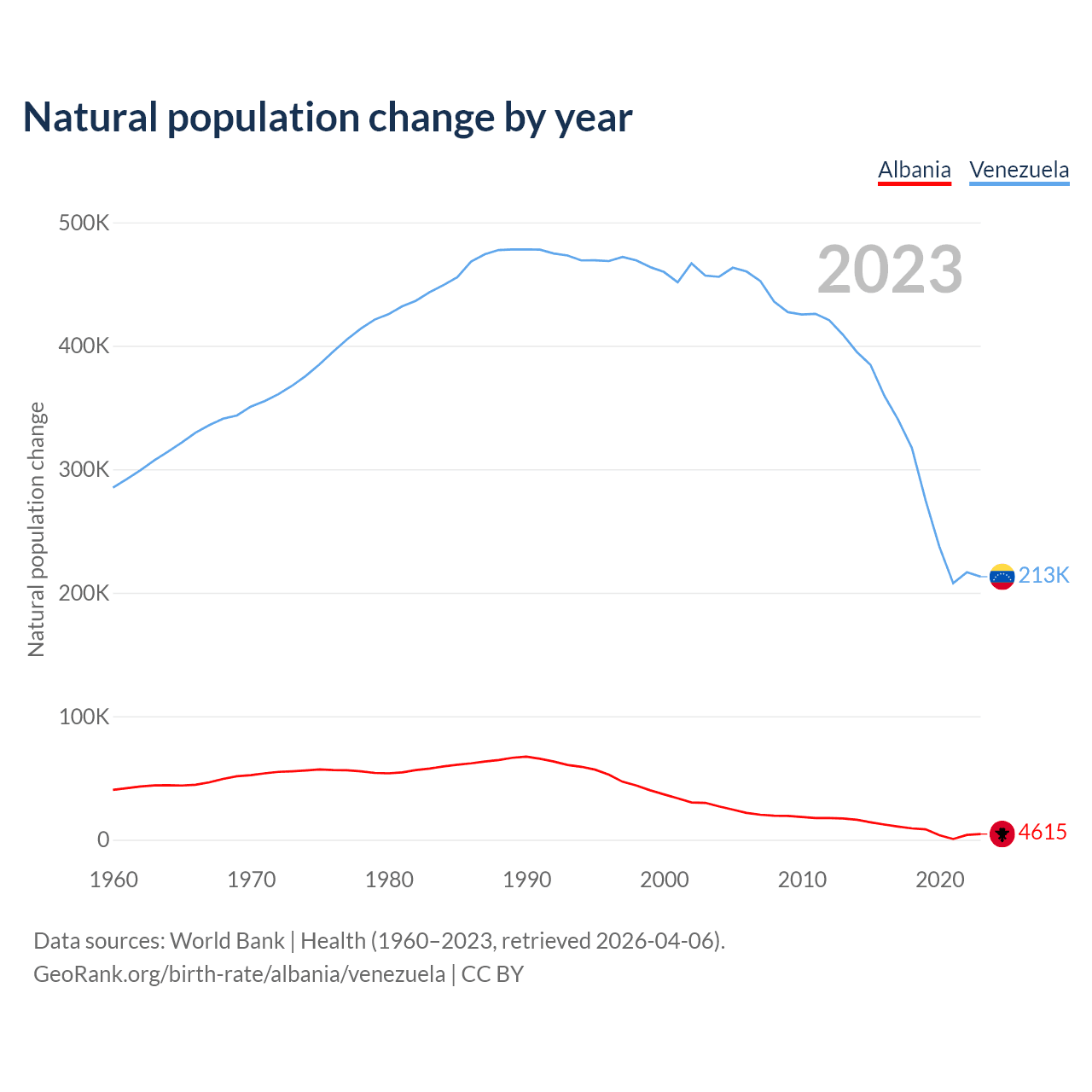 According to the latest available data on birth rates, the fertility rate in Albania was 1.35 children per woman in 2023, compared to 2.08 in Venezuela in 2023. The replacement level is considered to be 2.1 children per woman.