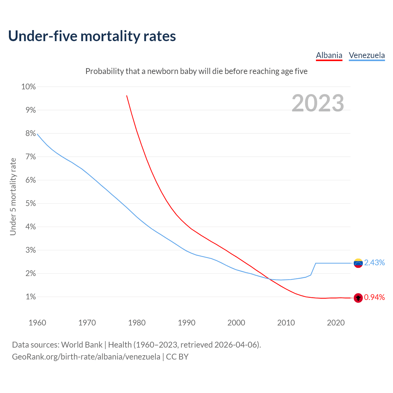 The chance that a newborn baby will die before reaching age five is 0.94% in Albania and 2.43% in Venezuela. Above is a chart with historical data on under-five mortality rates.