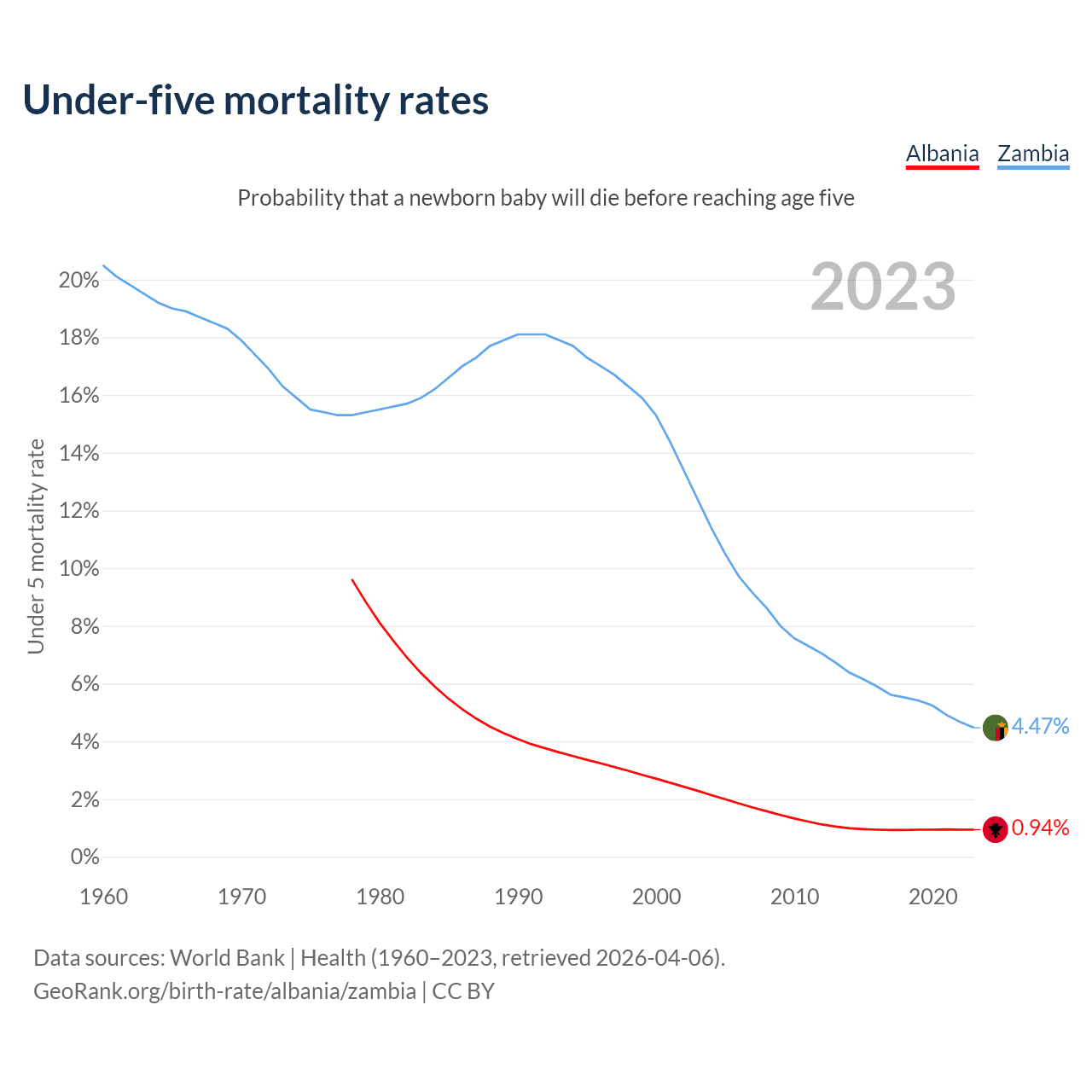 The chance that a newborn baby will die before reaching age five is 0.94% in Albania and 4.47% in Zambia. Above is a chart with historical data on under-five mortality rates.