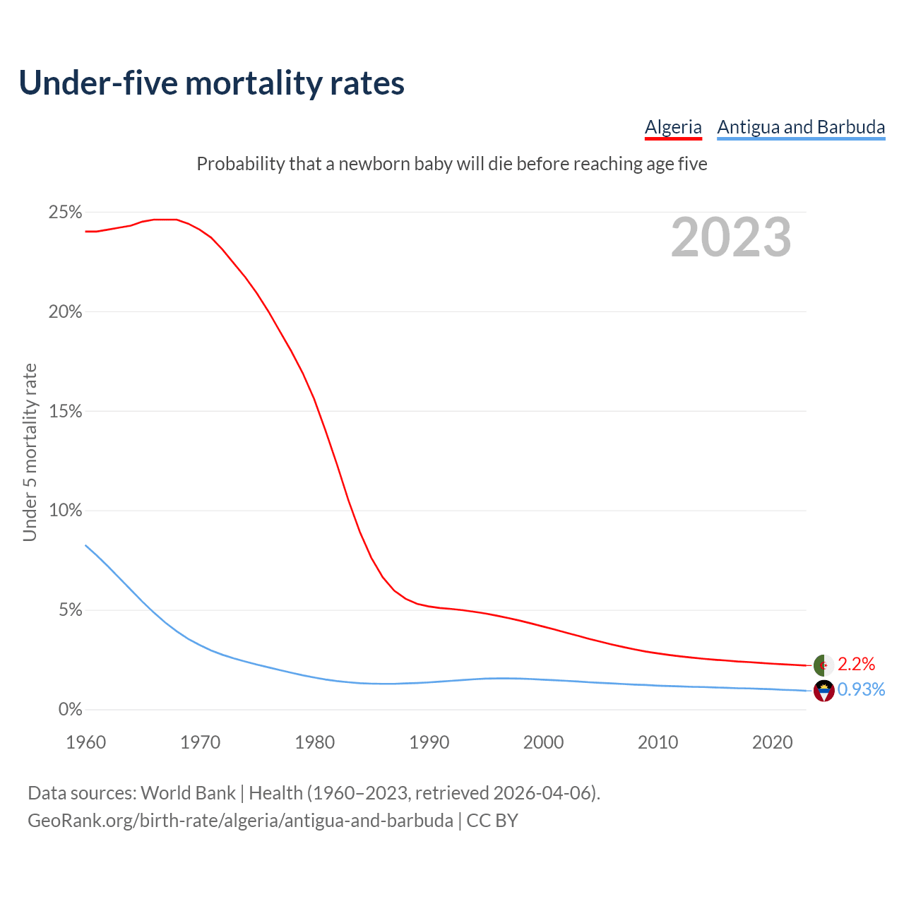 The chance that a newborn baby will die before reaching age five is 2.2% in Algeria and 0.93% in Antigua and Barbuda. Above is a chart with historical data on under-five mortality rates.