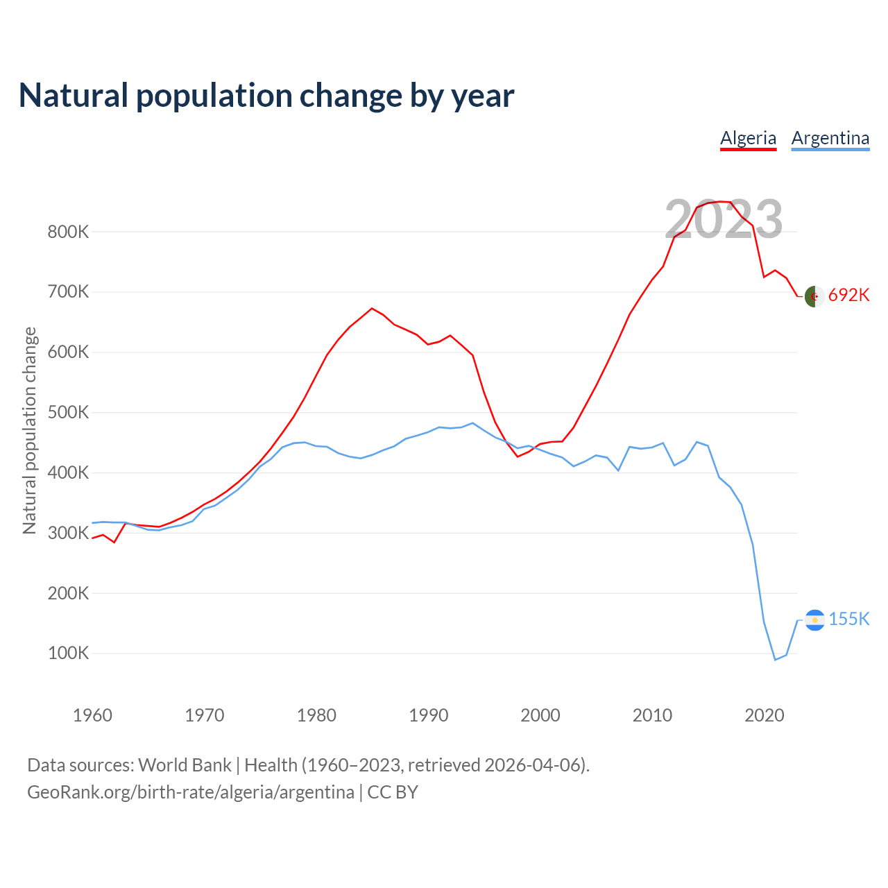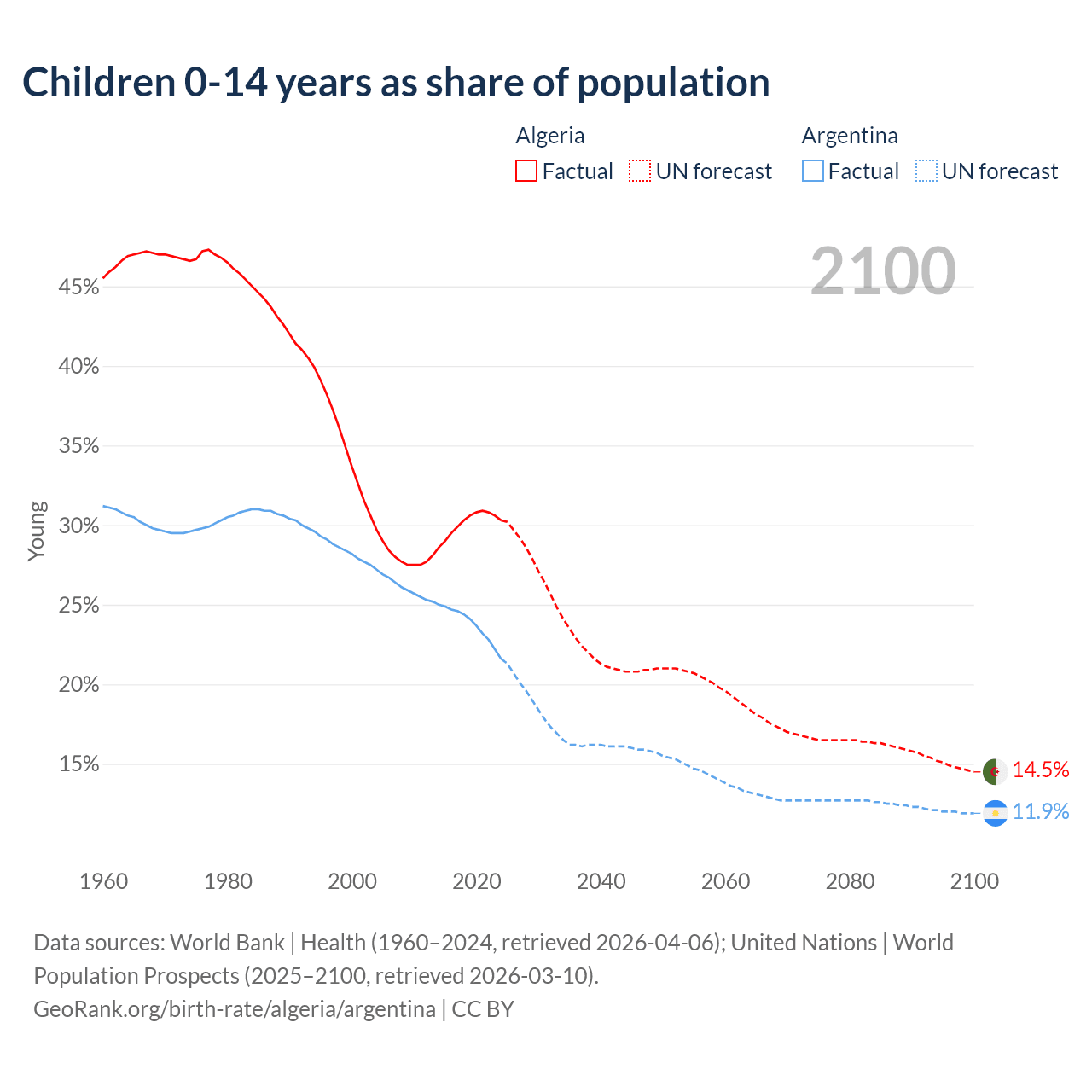 Algeria has an annual birth rate of 19.6 births per 1,000 people, compared to 11.1 for Argentina. The average number of children a woman is expected to have during her lifetime — the fertility rate, is 2.77 in Algeria and 1.5 in Argentina — 45.8% difference.