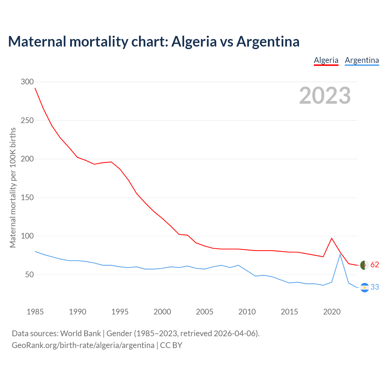 The maternal mortality rate, which is the probability of dying during childbirth or within 42 days of pregnancy termination, is 62 deaths per 100,000 live births in Algeria, compared to 33 deaths in Argentina.