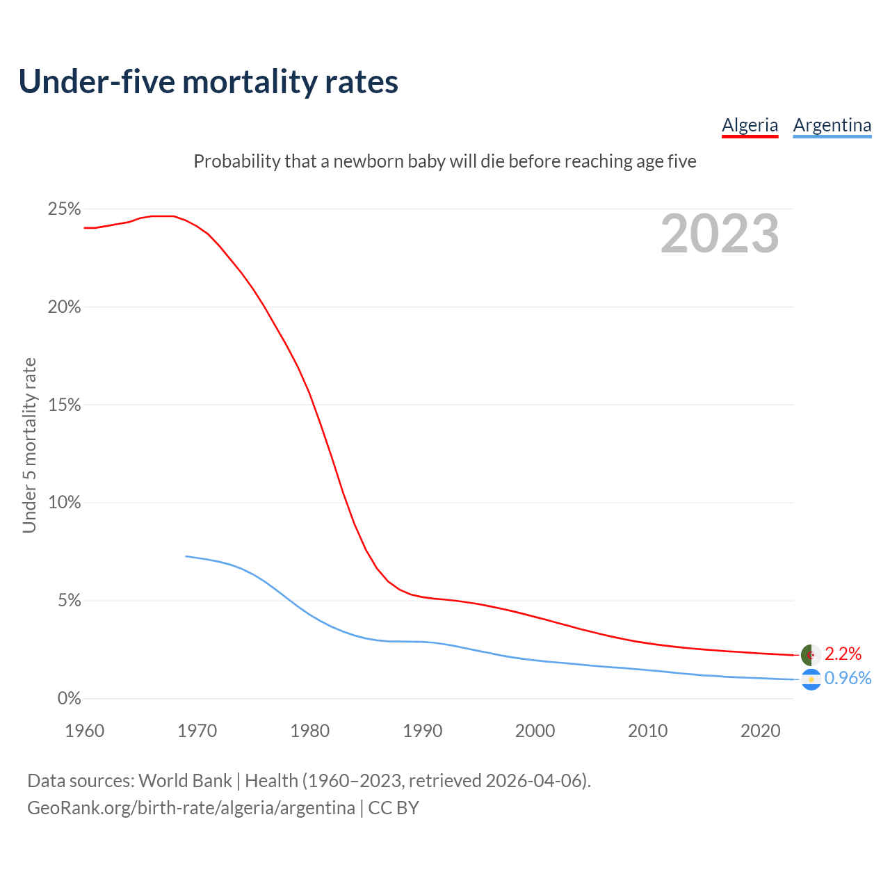 The chance that a newborn baby will die before reaching age five is 2.2% in Algeria and 0.96% in Argentina. Above is a chart with historical data on under-five mortality rates.