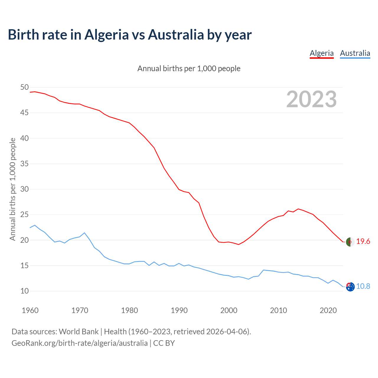 Algeria has an annual birth rate of 19.6 births per 1,000 people, compared to 10.8 for Australia. The average number of children a woman is expected to have during her lifetime — the fertility rate, is 2.77 in Algeria and 1.5 in Australia — 45.8% difference.