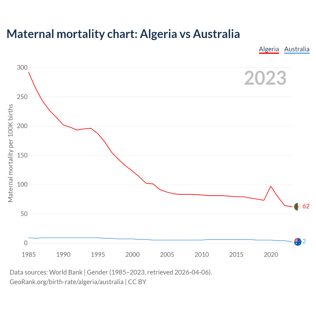 The maternal mortality rate, which is the probability of dying during childbirth or within 42 days of pregnancy termination, is 62 deaths per 100,000 live births in Algeria, compared to 2 deaths in Australia.
