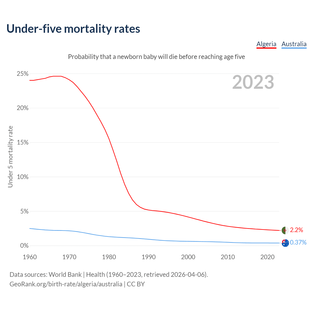 The chance that a newborn baby will die before reaching age five is 2.2% in Algeria and 0.37% in Australia. Above is a chart with historical data on under-five mortality rates.
