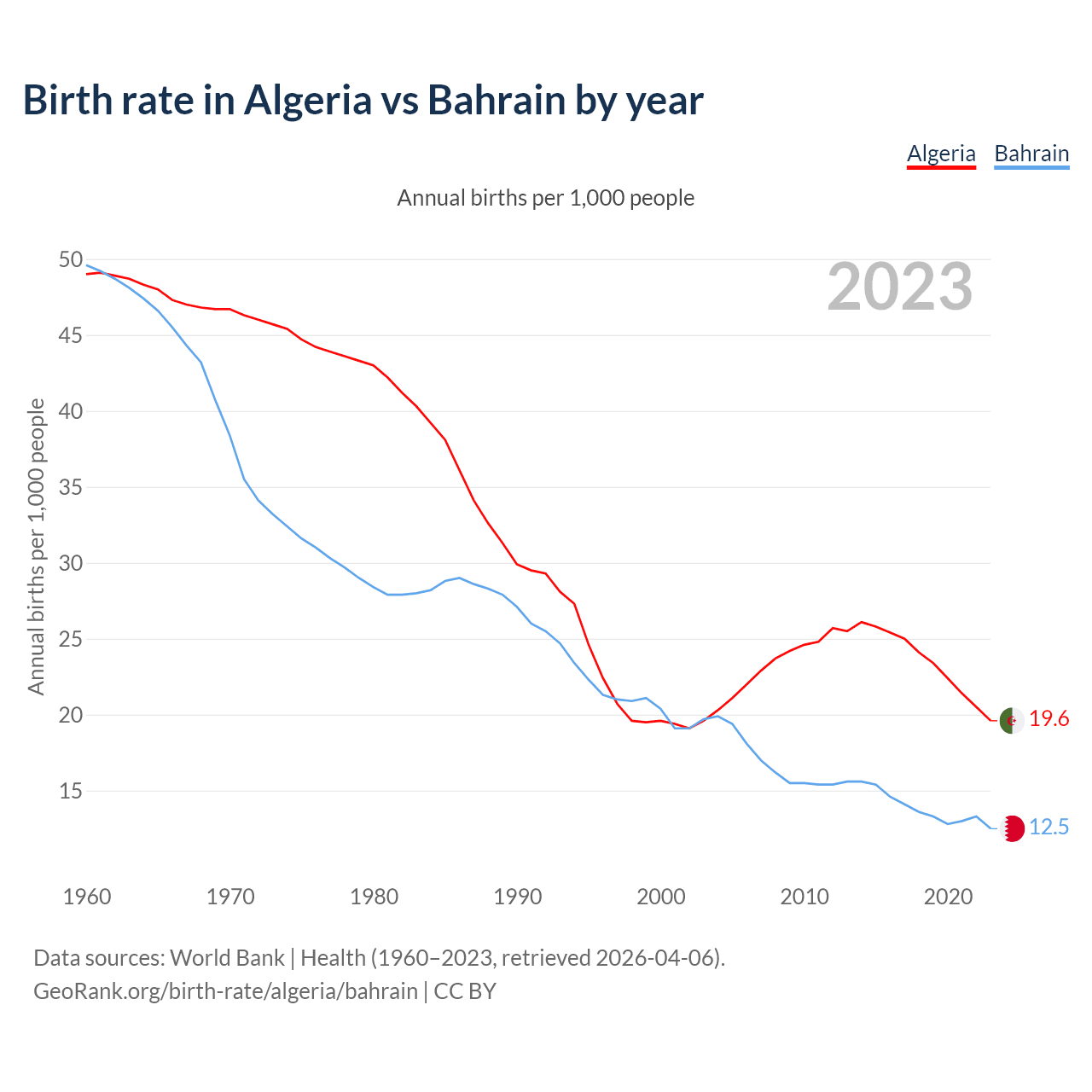 Algeria has an annual birth rate of 19.6 births per 1,000 people, compared to 12.5 for Bahrain. The average number of children a woman is expected to have during her lifetime — the fertility rate, is 2.77 in Algeria and 1.82 in Bahrain — 34.1% difference.