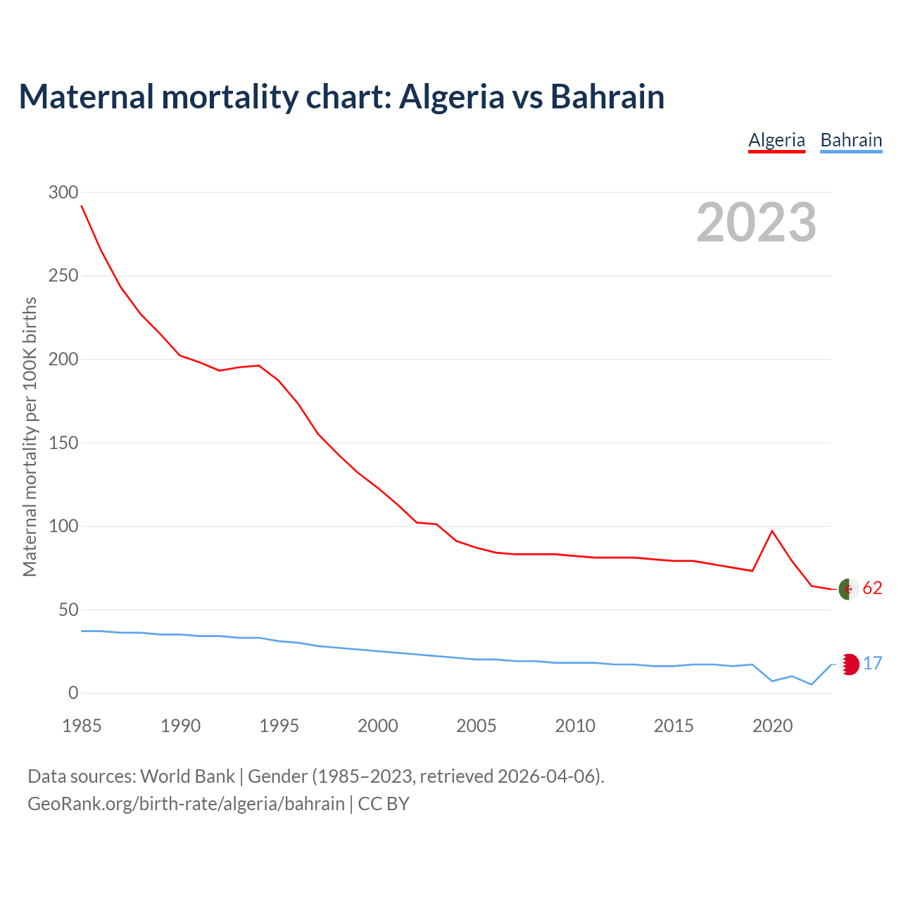 The maternal mortality rate, which is the probability of dying during childbirth or within 42 days of pregnancy termination, is 62 deaths per 100,000 live births in Algeria, compared to 17 deaths in Bahrain.