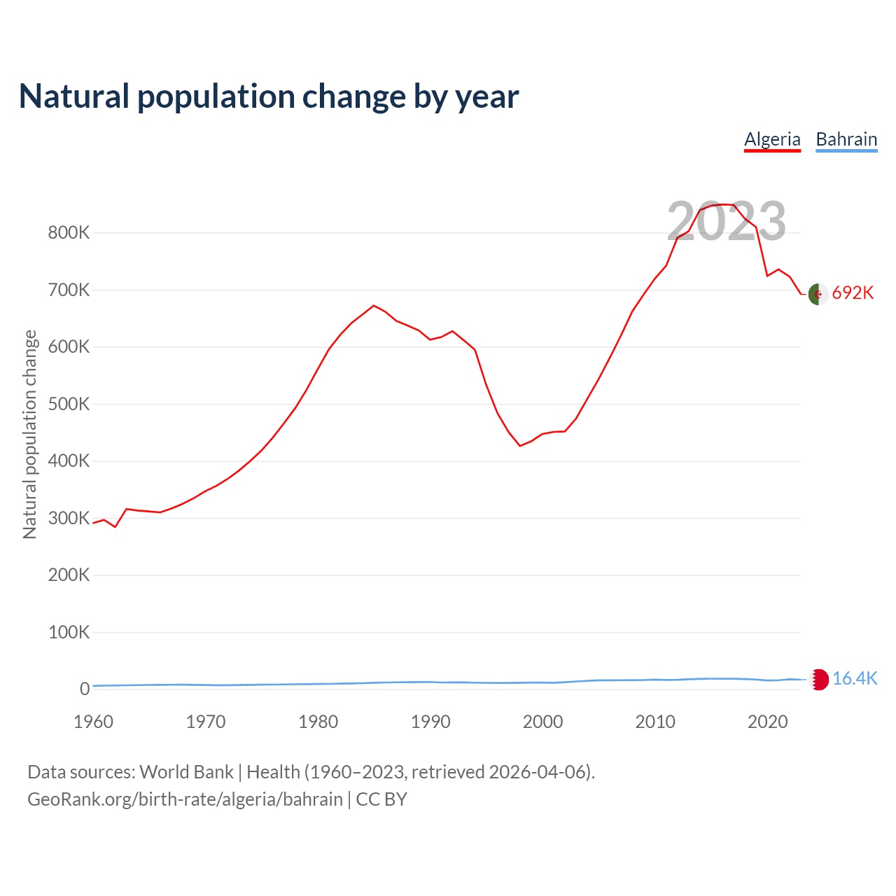 According to the latest available data on birth rates, the fertility rate in Algeria was 2.77 children per woman in 2023, compared to 1.82 in Bahrain in 2023. The replacement level is considered to be 2.1 children per woman.