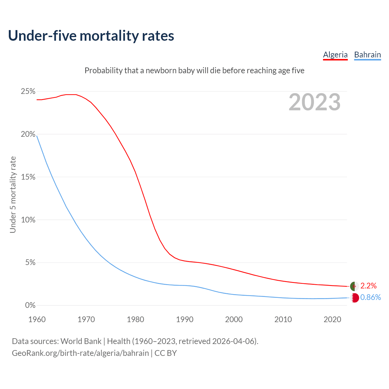 The chance that a newborn baby will die before reaching age five is 2.2% in Algeria and 0.86% in Bahrain. Above is a chart with historical data on under-five mortality rates.