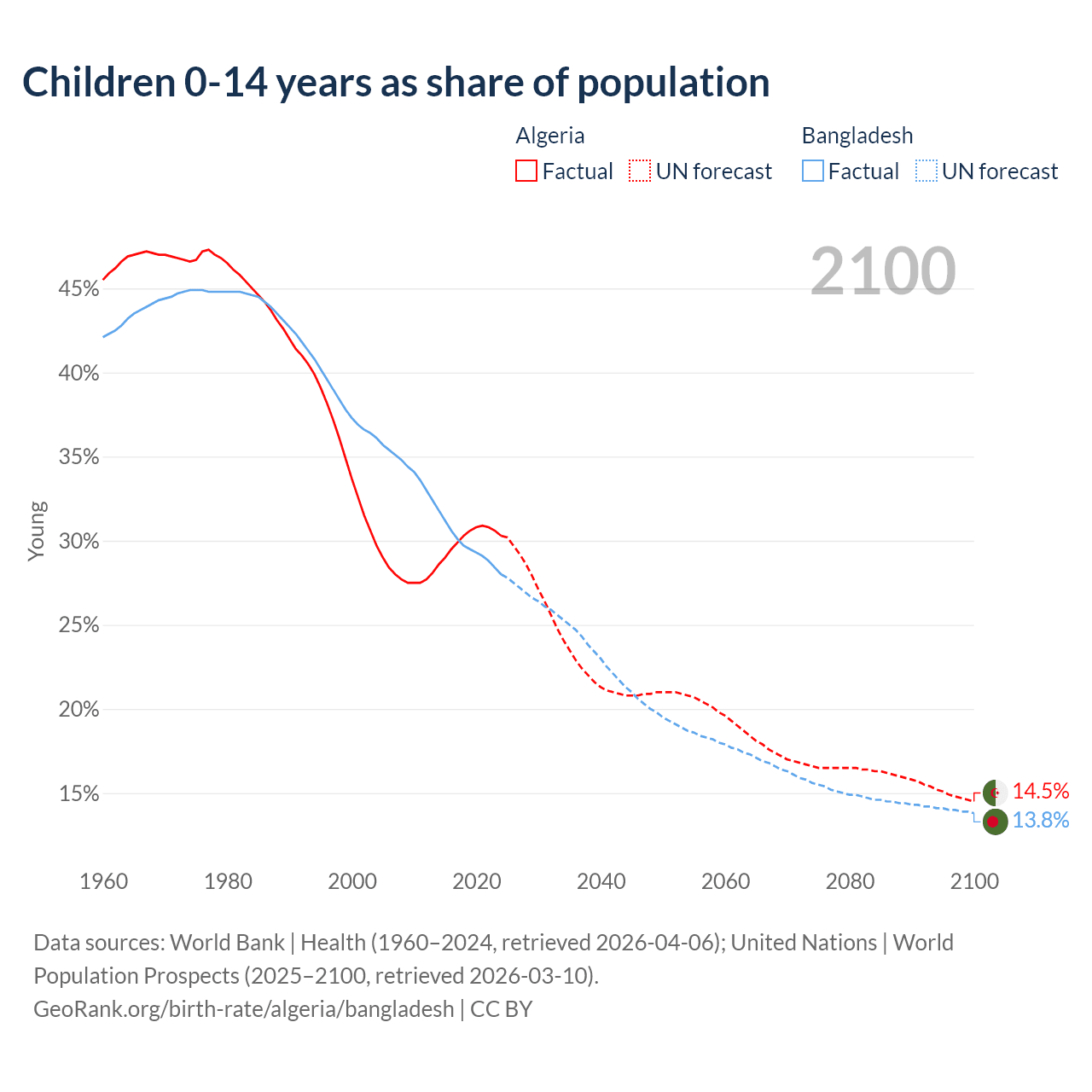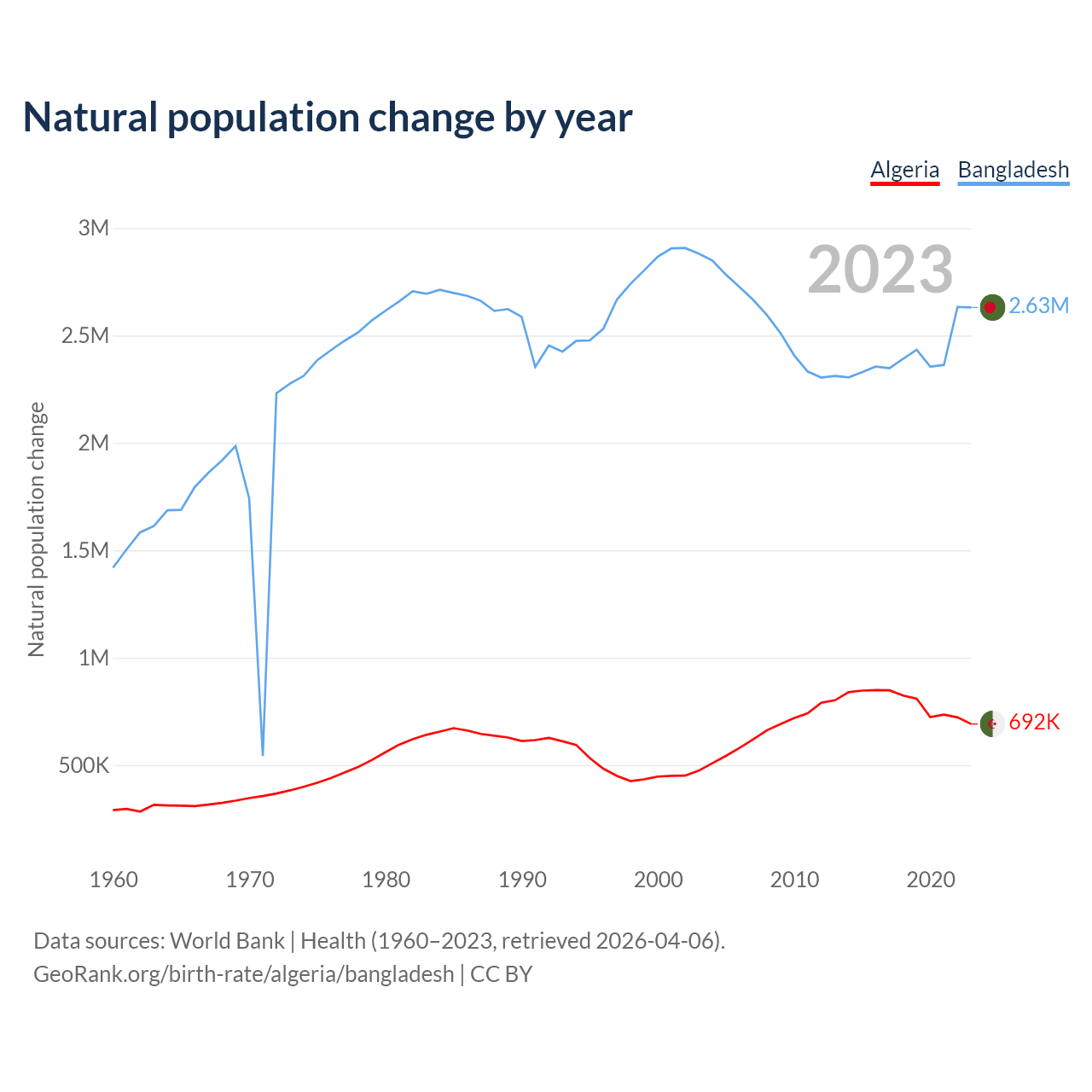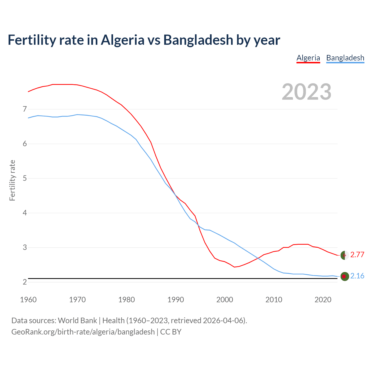 According to the latest available data on birth rates, the fertility rate in Algeria was 2.77 children per woman in 2023, compared to 2.16 in Bangladesh in 2023. The replacement level is considered to be 2.1 children per woman.