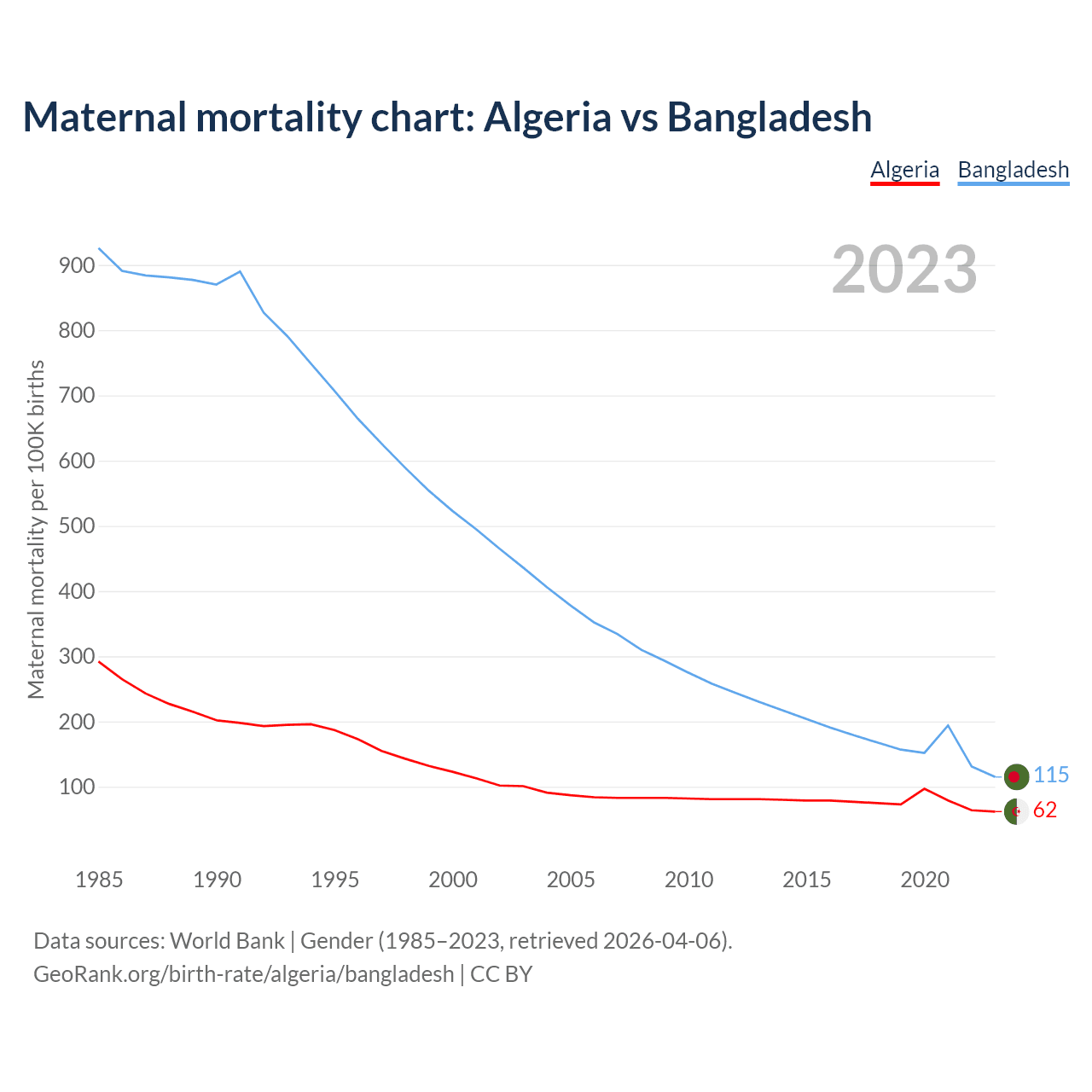The maternal mortality rate, which is the probability of dying during childbirth or within 42 days of pregnancy termination, is 62 deaths per 100,000 live births in Algeria, compared to 115 deaths in Bangladesh.