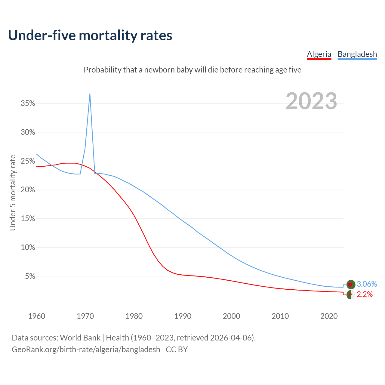 The chance that a newborn baby will die before reaching age five is 2.2% in Algeria and 3.06% in Bangladesh. Above is a chart with historical data on under-five mortality rates.
