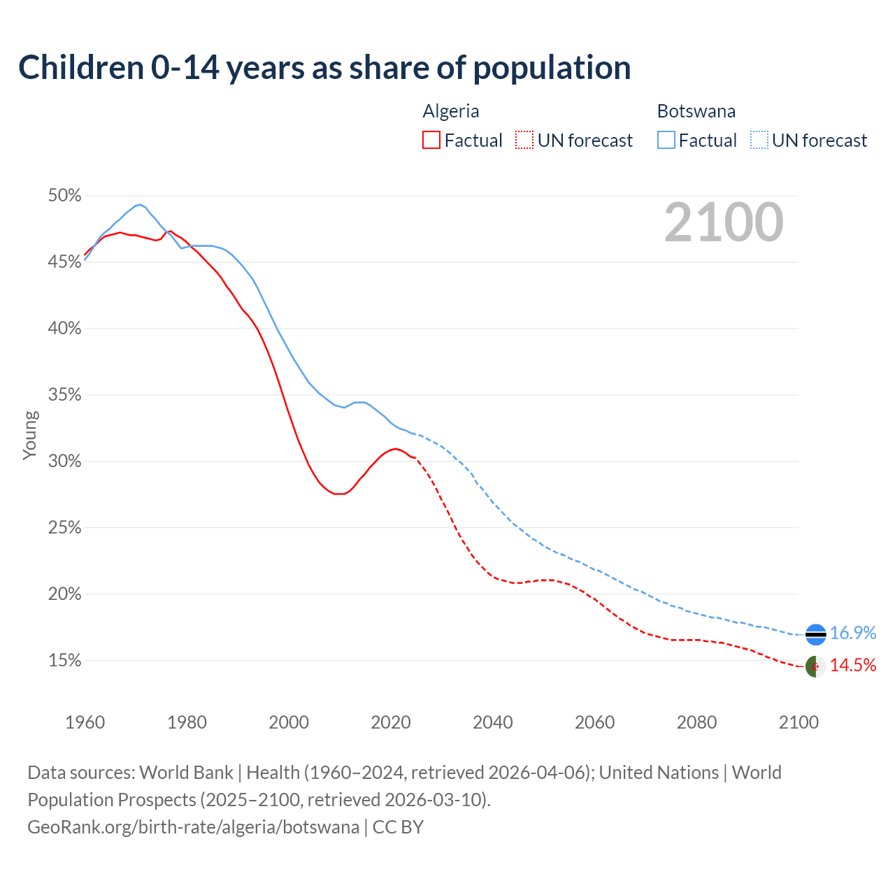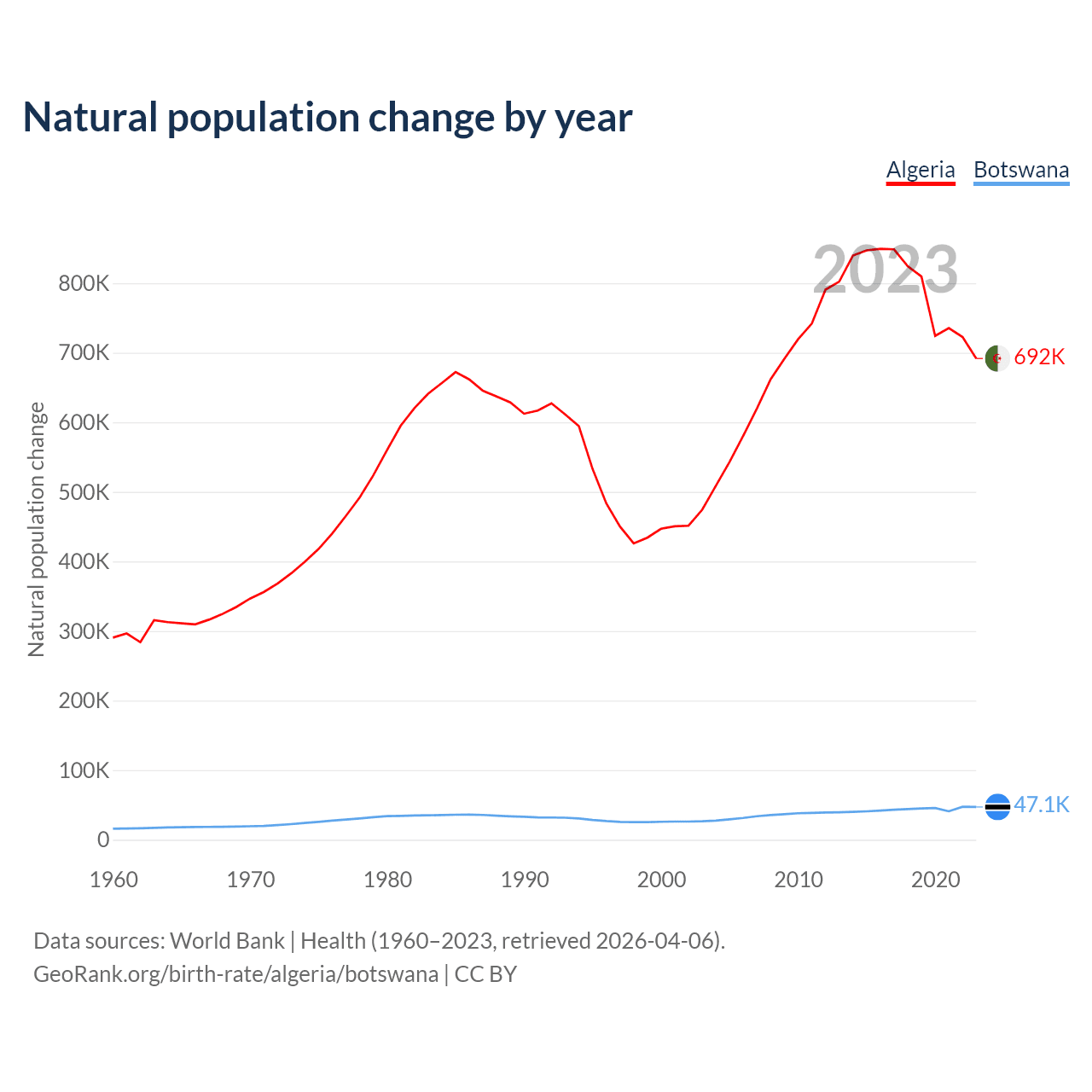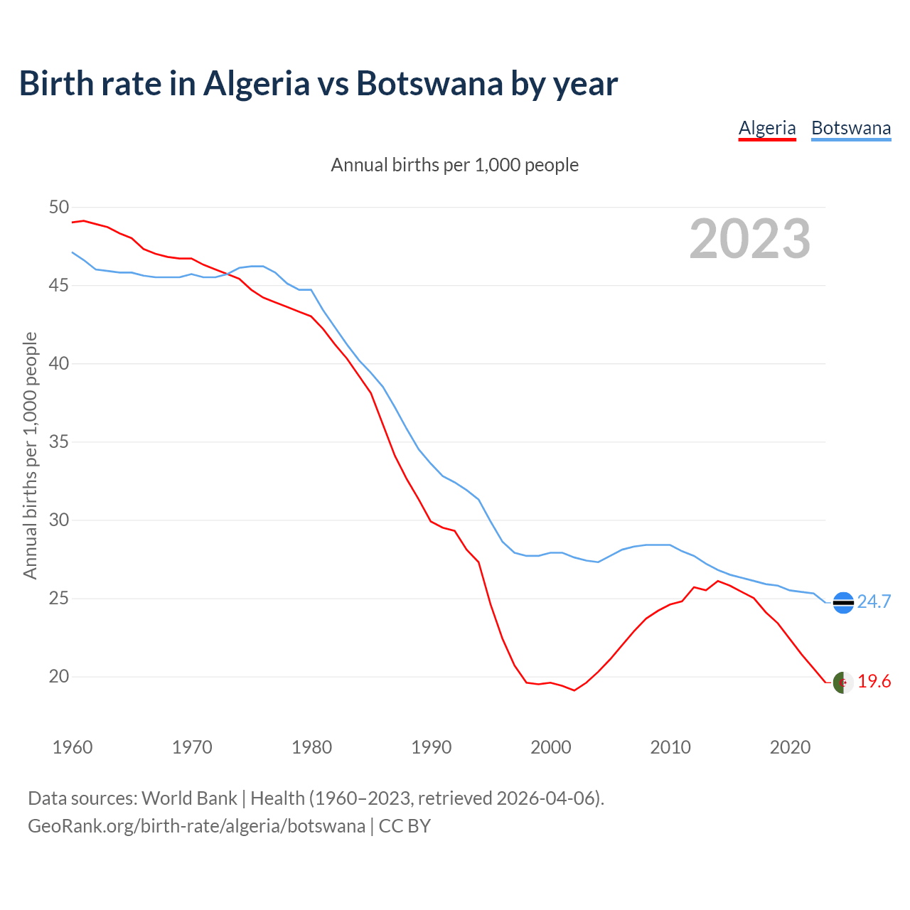 Algeria has an annual birth rate of 19.6 births per 1,000 people, compared to 24.7 for Botswana. The average number of children a woman is expected to have during her lifetime — the fertility rate, is 2.77 in Algeria and 2.73 in Botswana — 1.23% difference.