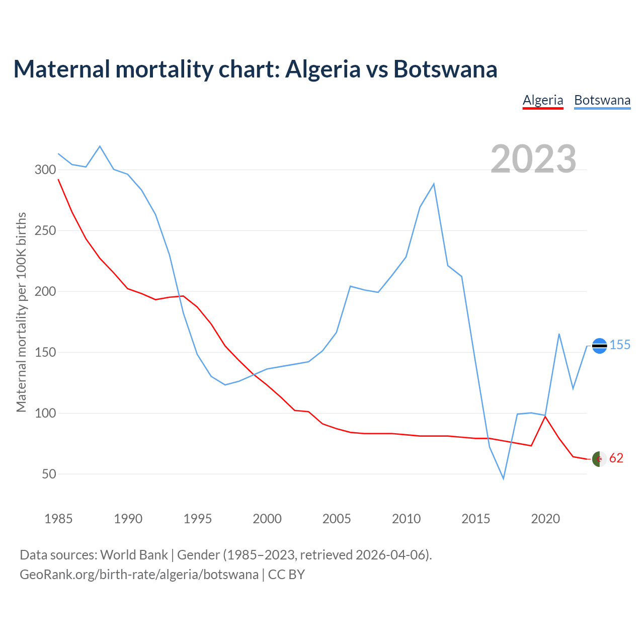 The maternal mortality rate, which is the probability of dying during childbirth or within 42 days of pregnancy termination, is 62 deaths per 100,000 live births in Algeria, compared to 155 deaths in Botswana.