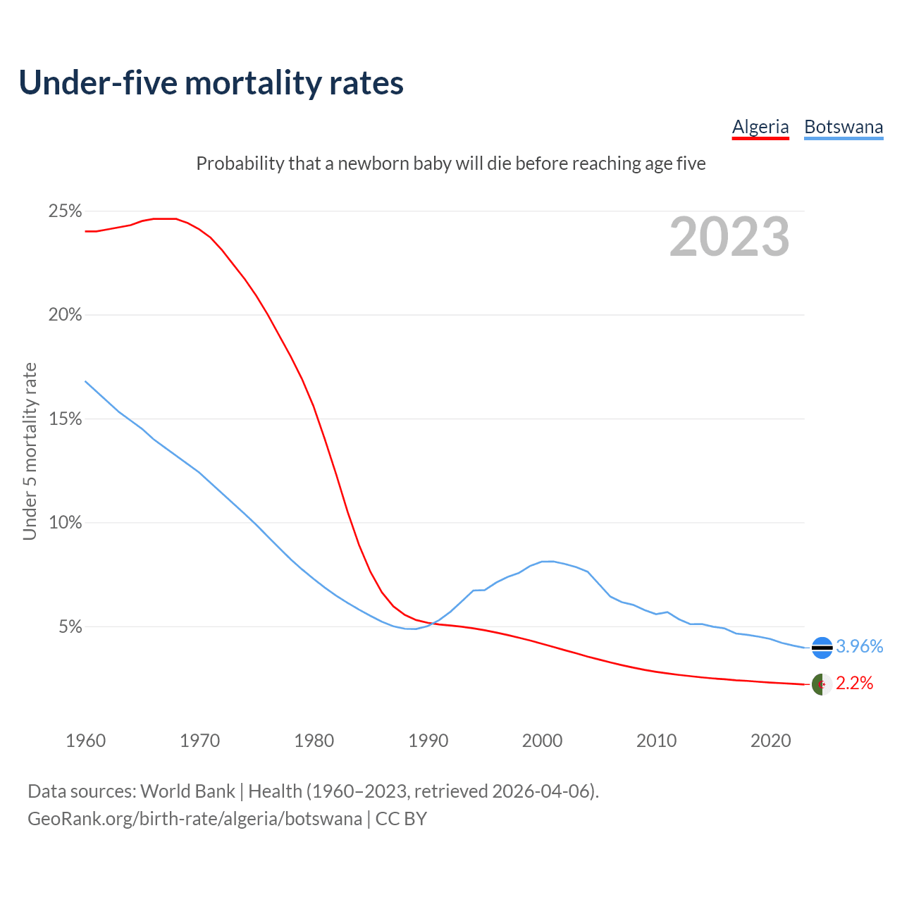The chance that a newborn baby will die before reaching age five is 2.2% in Algeria and 3.96% in Botswana. Above is a chart with historical data on under-five mortality rates.