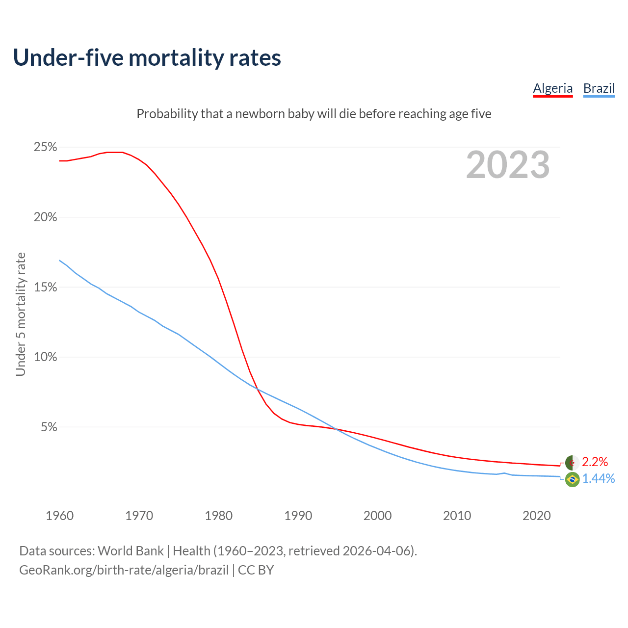The chance that a newborn baby will die before reaching age five is 2.2% in Algeria and 1.44% in Brazil. Above is a chart with historical data on under-five mortality rates.