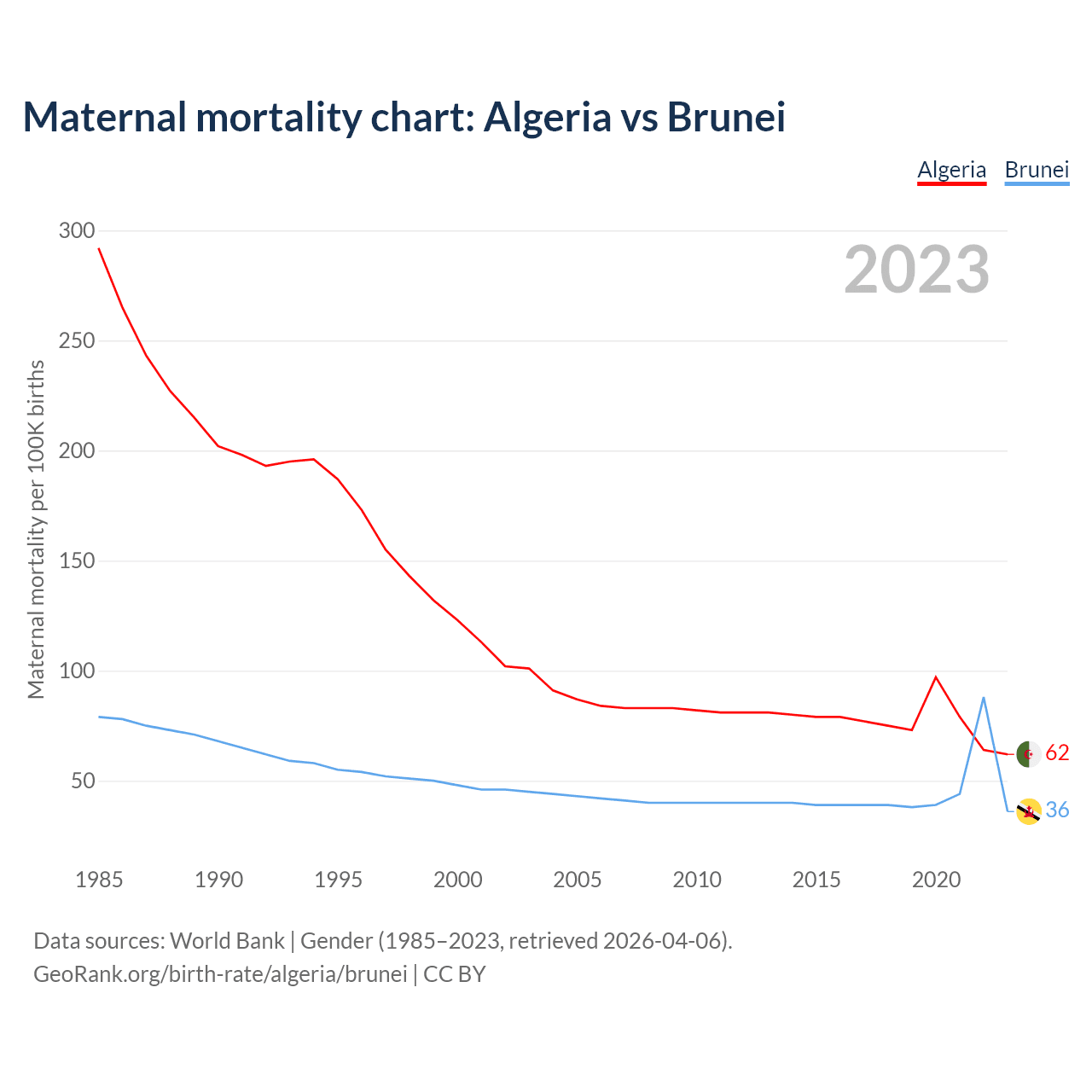 The maternal mortality rate, which is the probability of dying during childbirth or within 42 days of pregnancy termination, is 62 deaths per 100,000 live births in Algeria, compared to 36 deaths in Brunei.