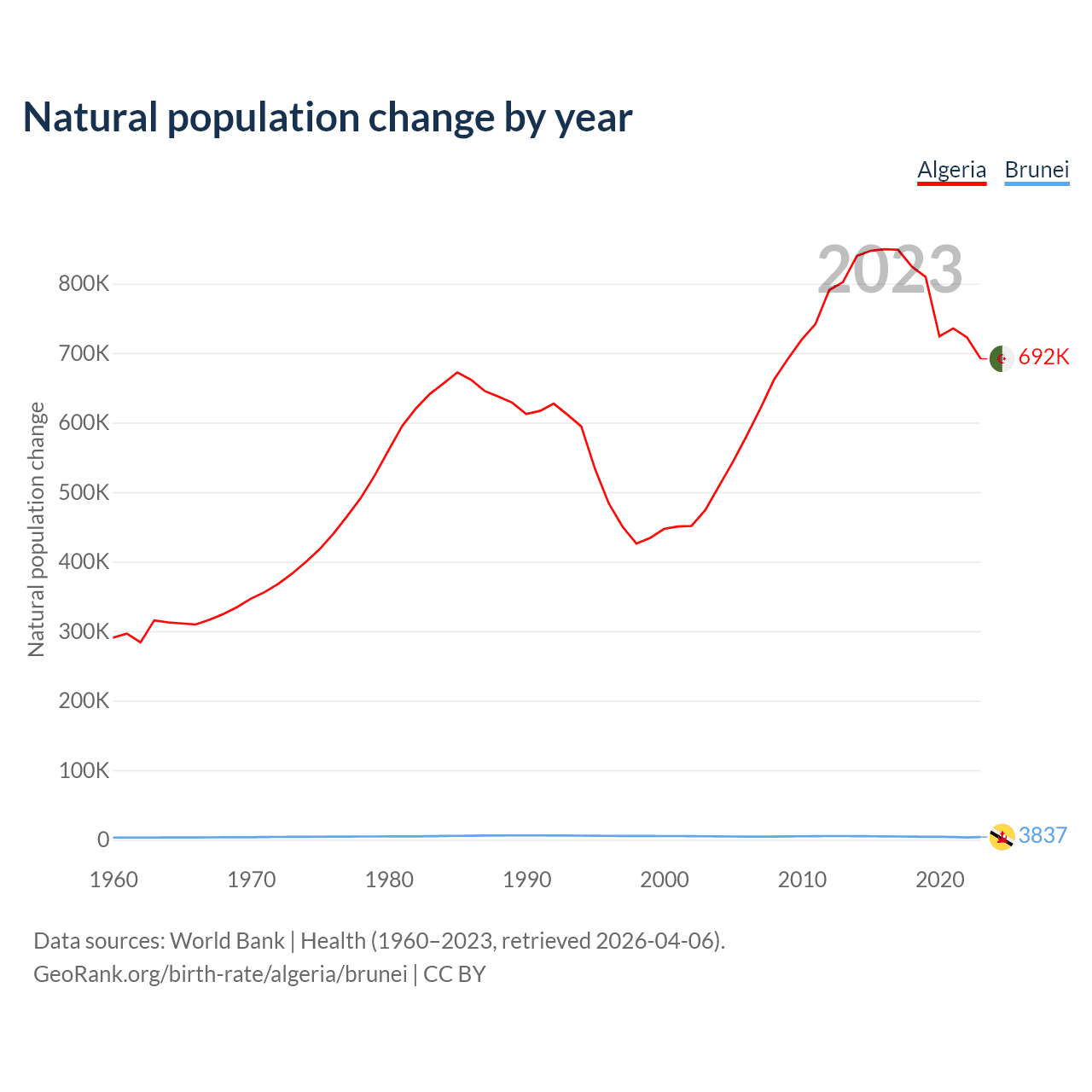 Algeria has an annual birth rate of 19.6 births per 1,000 people, compared to 13.6 for Brunei. The average number of children a woman is expected to have during her lifetime — the fertility rate, is 2.77 in Algeria and 1.75 in Brunei — 36.8% difference.