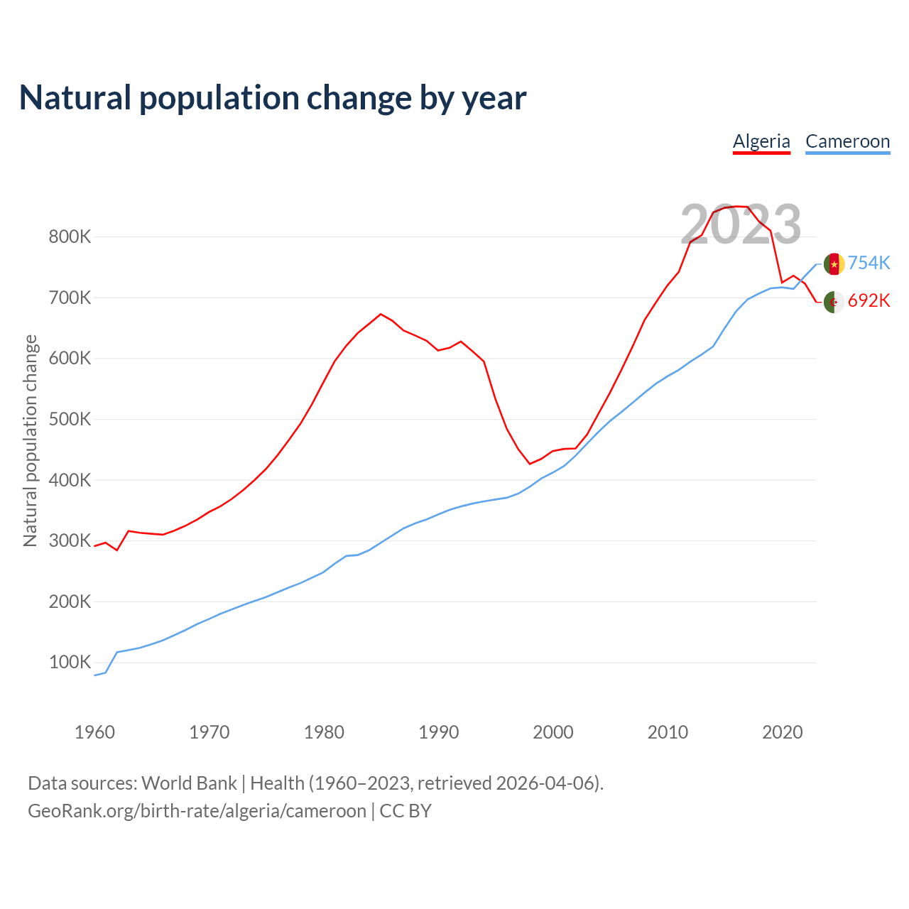 Check Algeria vs Cameroon population clock for a dynamic visualization of the changing population.