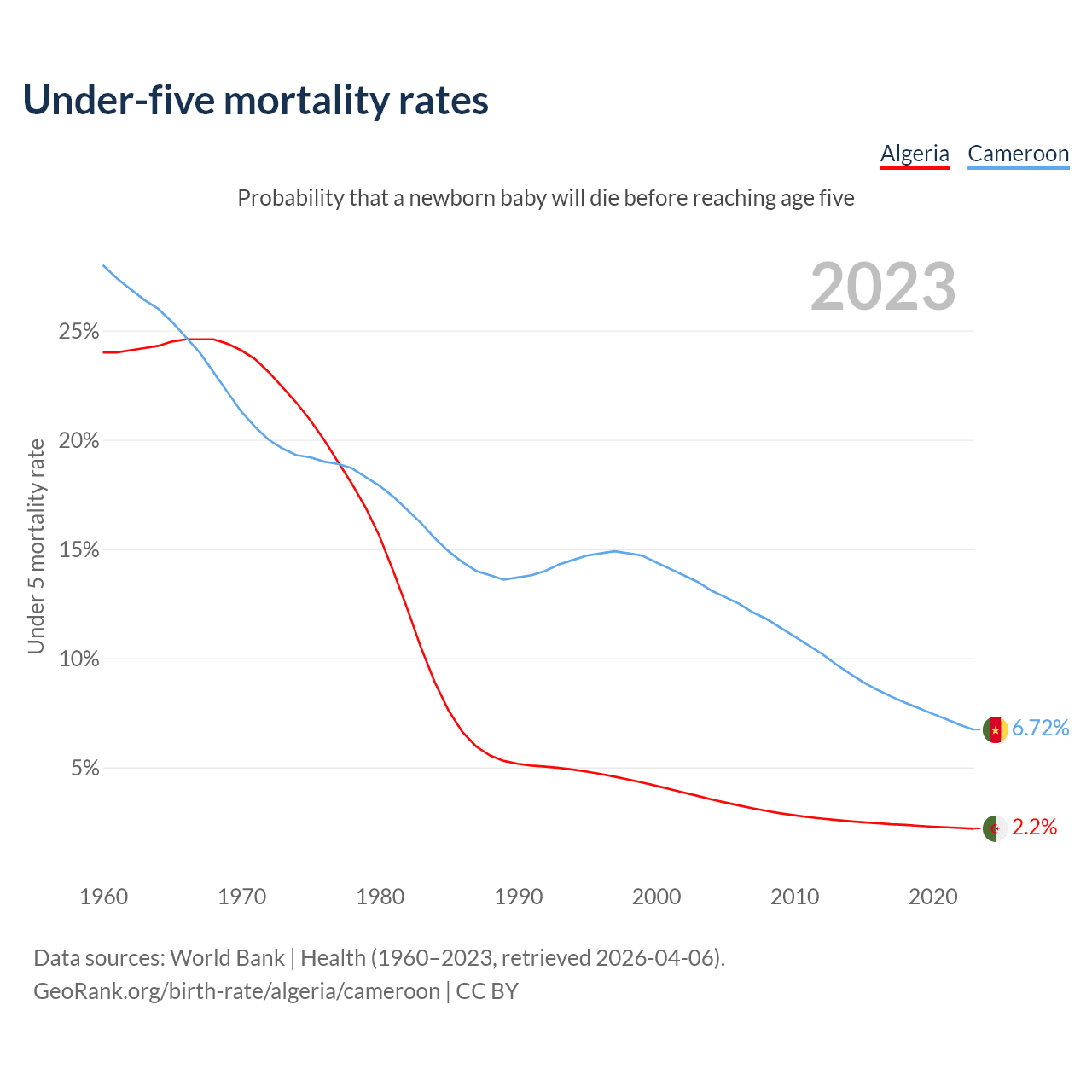 The chance that a newborn baby will die before reaching age five is 2.2% in Algeria and 6.72% in Cameroon. Above is a chart with historical data on under-five mortality rates.