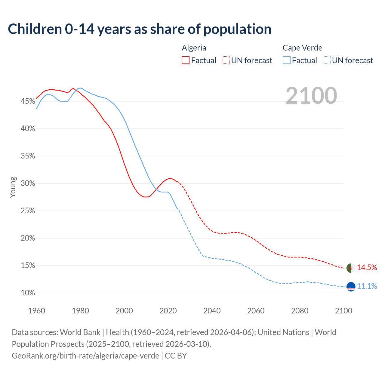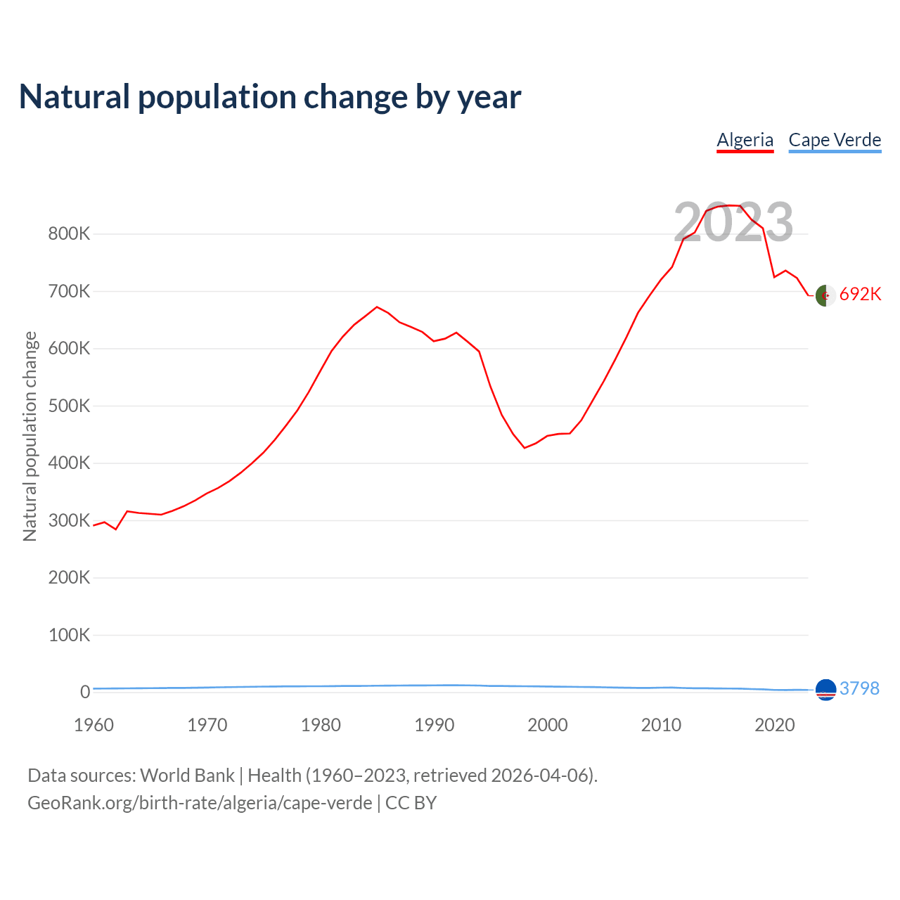 According to the latest available data on birth rates, the fertility rate in Algeria was 2.77 children per woman in 2023, compared to 1.52 in Cape Verde in 2023. The replacement level is considered to be 2.1 children per woman.