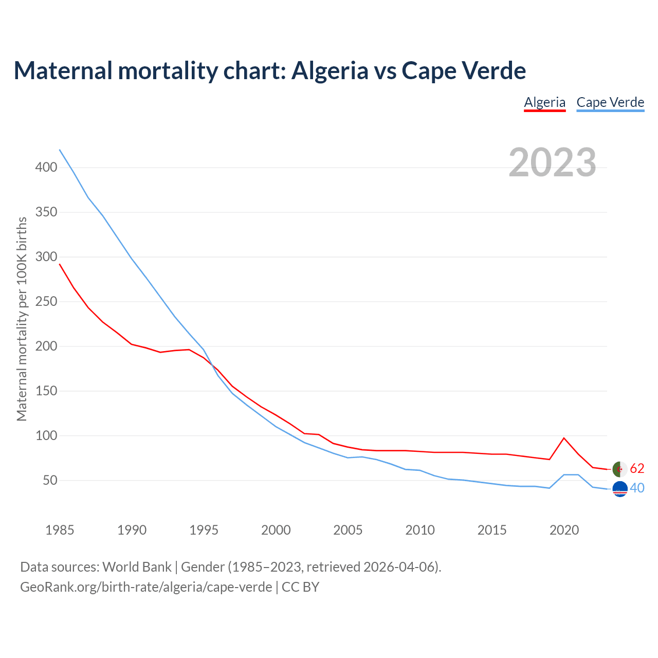 The maternal mortality rate, which is the probability of dying during childbirth or within 42 days of pregnancy termination, is 62 deaths per 100,000 live births in Algeria, compared to 40 deaths in Cape Verde.