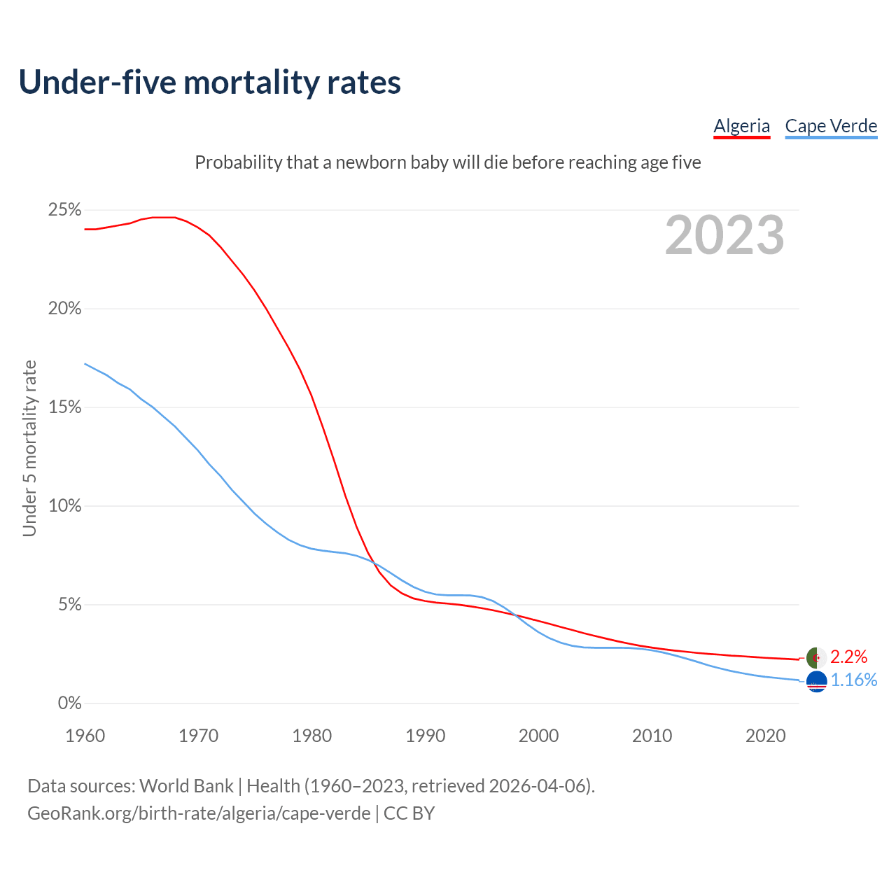 The chance that a newborn baby will die before reaching age five is 2.2% in Algeria and 1.16% in Cape Verde. Above is a chart with historical data on under-five mortality rates.