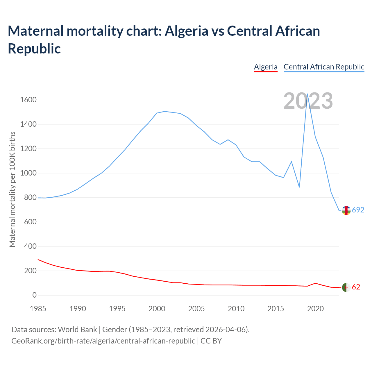 Data sources: World Bank | Gender (1985–2023, retrieved 2026-04-06).