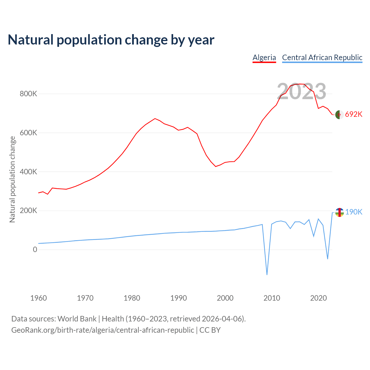 Algeria has an annual birth rate of 19.6 births per 1,000 people, compared to 46.4 for the Central African Republic. The average number of children a woman is expected to have during her lifetime — the fertility rate, is 2.77 in Algeria and 6.01 in the Central African Republic — 117.4% difference.