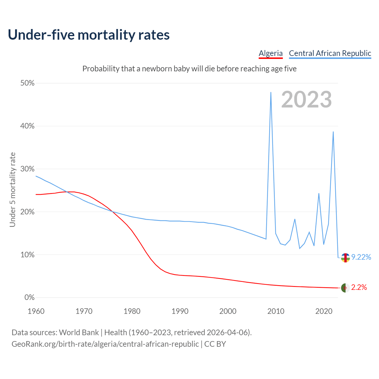 The chance that a newborn baby will die before reaching age five is 2.2% in Algeria and 9.22% in the Central African Republic. Above is a chart with historical data on under-five mortality rates.