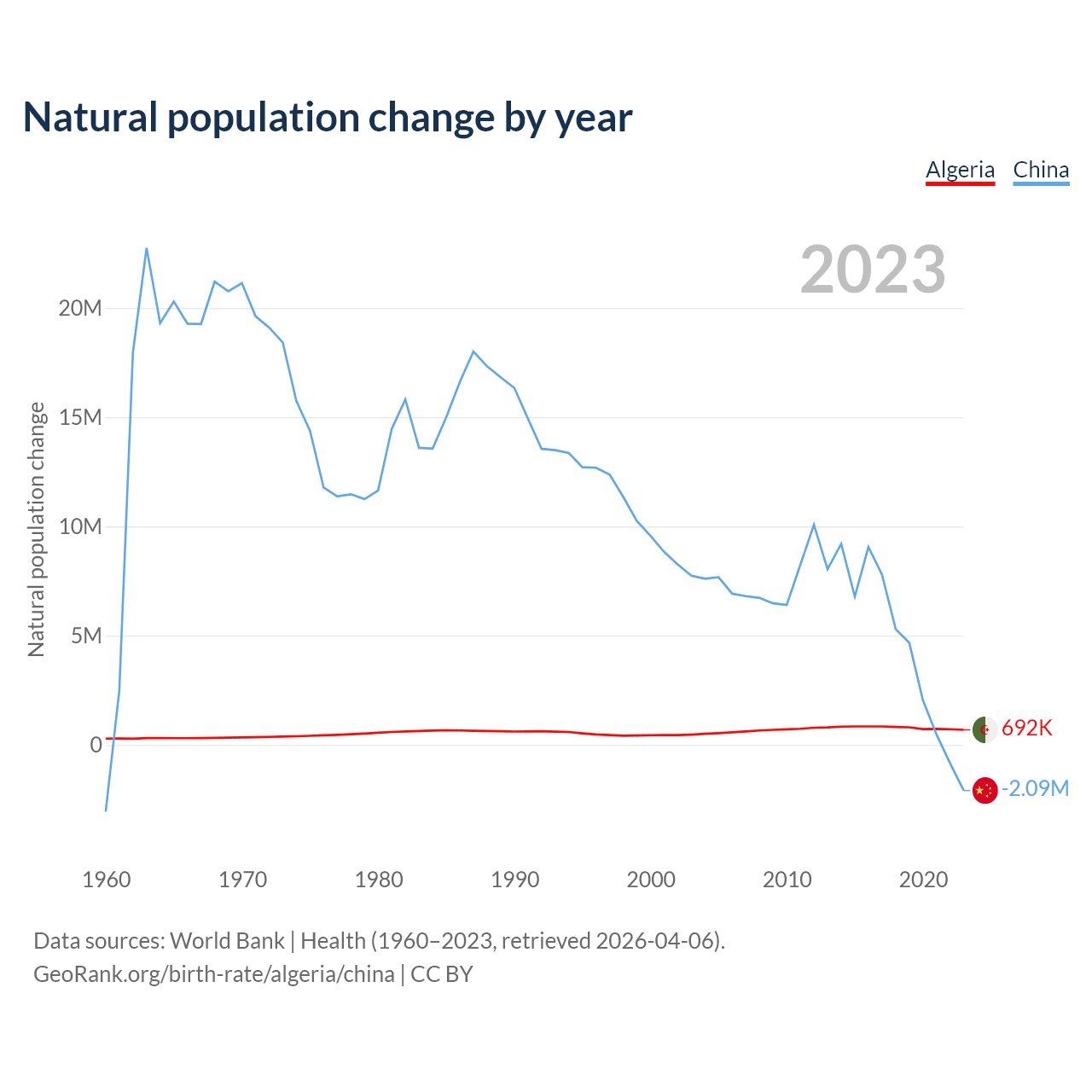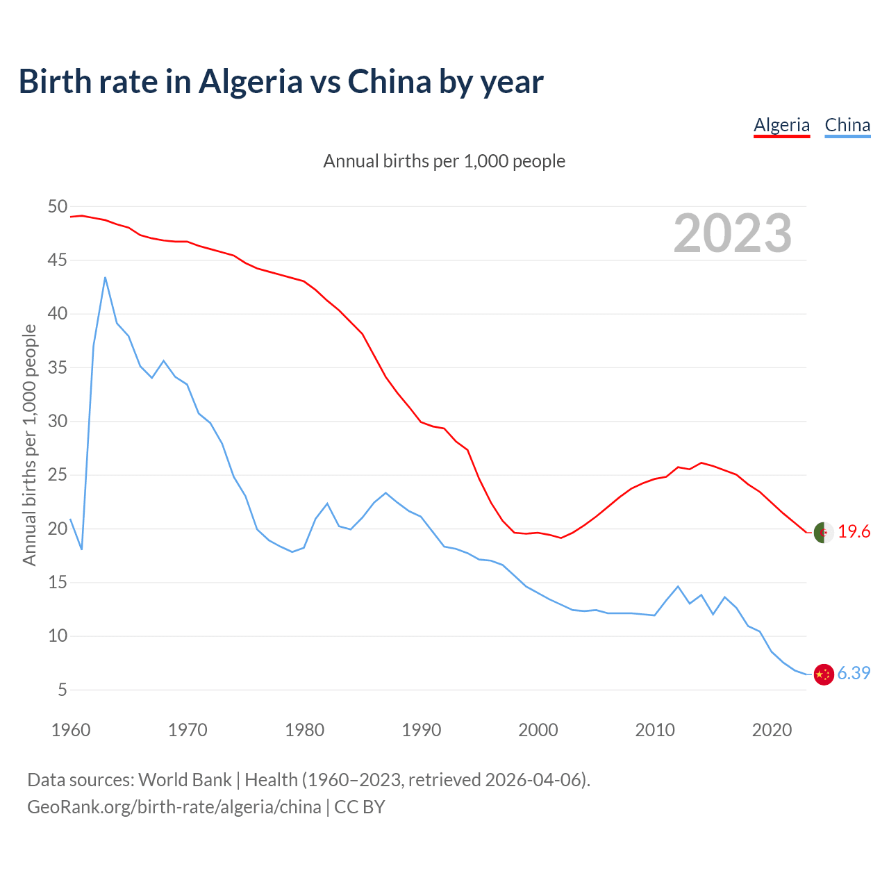 Algeria has an annual birth rate of 19.6 births per 1,000 people, compared to 6.39 for China. The average number of children a woman is expected to have during her lifetime — the fertility rate, is 2.77 in Algeria and 1 in China — 63.9% difference.